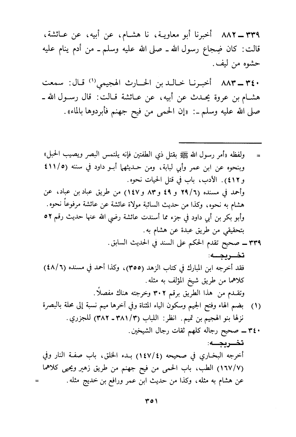 883 - أَخْبَرَنَا خَالِدُ بْنُ الْحَارِثِ الَهُجَيْمِيُّ، قَالَ سَمِعْتُ هِشَامَ بْنَ عُرْوَةَ، يُحَدِّثُ عَنْ أَبِيهِ، عَنْ عَائِشَةَ، قَالَتْ قَالَ رَسُولُ اللَّهِ صَلَّى اللهُ عَلَيْهِ وَسَلَّمَ إِنَّ §الْحُمَّى مِنْ فَيْحِ جَهَنَّمِ فَأَبْرِدُوهَا بِالْمَاءِ