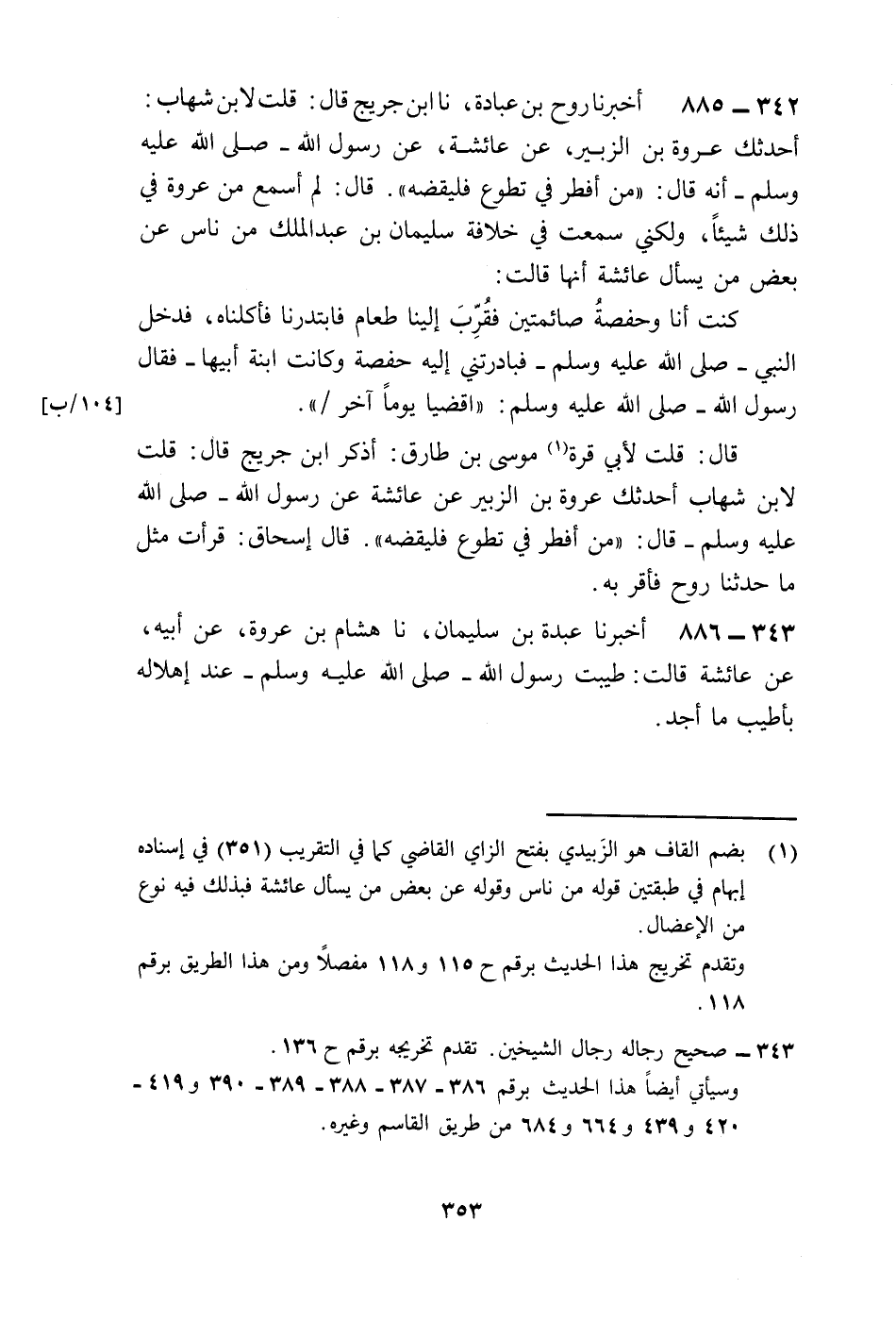 885 - أَخْبَرَنَا رَوْحُ بْنُ عُبَادَةَ، نا ابْنُ جُرَيْجٍ، قَالَ: قُلْتُ لِابْنِ شِهَابٍ أَحَدَّثَكَ عُرْوَةُ بْنُ الزُّبَيْرِ عَنْ عَائِشَةَ عَنْ رَسُولِ اللَّهِ صَلَّى اللهُ عَلَيْهِ وَسَلَّمَ أَنَّهُ قَالَ §مَنْ أَفْطَرَ فِي تَطَوُّعٍ فَلْيَقْضِهْ قَالَ لَمْ أَسْمَعْ مِنْ عُرْوَةَ فِي ذَلِكَ شَيْئًا وَلَكِنِّي سَمِعْتُ فِي خِلَافَةِ سُلَيْمَانَ بْنِ عَبْدِ الْمَلِكِ مِنْ نَاسٍ عَنْ بَعْضِ مَنْ يَسْأَلُ عَائِشَةَ أَنَّهَا قَالَتْ كُنْتُ أَنَا وَحَفْصَةُ صَائِمَتَيْنِ فَقُرِّبَ إِلَيْنَا طَعَامٌ فَابْتَدَرْنَا فَأَكَلْنَاهُ فَدَخَلَ النَّبِيُّ صَلَّى اللهُ عَلَيْهِ وَسَلَّمَ فَبَادَرَتْنِي إِلَيْهِ حَفْصَةُ وَكَانَتِ ابْنَةَ أَبِيهَا فَقَالَ رَسُولُ اللَّهِ صَلَّى اللهُ عَلَيْهِ وَسَلَّمَ اقْضِيَا يَوْمًا آخَرَ قَالَ قُلْتُ لِأَبِي قُرَّةَ مُوسَى بْنِ طَارِقٍ أَذَكَرَ ابْنَ جُرَيْجٍ قَالَ قُلْتُ لِابْنِ شِهَابٍ أَحَدَّثَكَ عُرْوَةُ بْنُ الزُّبَيْرِ عَنْ عَائِشَةَ عَنْ رَسُولِ اللَّهِ صَلَّى اللهُ عَلَيْهِ وَسَلَّمَ قَالَ مَنْ أَفْطَرَ فِي تَطَوُّعٍ فَلْيَقْضِهْ. قَالَ إِسْحَاقُ قَرَأْتُ مِثْلَ مَا حَدَّثَنَا رَوْحٌ فَأَقَرَّ بِهِ