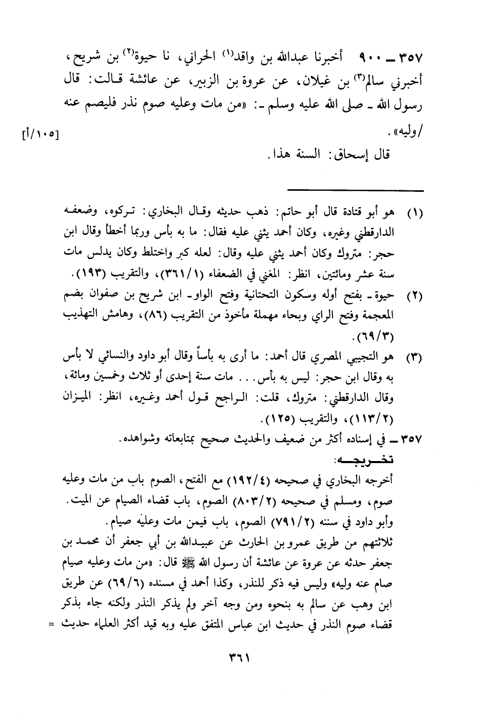 900 - أَخْبَرَنَا عَبْدُ اللَّهِ بْنُ وَاقِدٍ الْحَرَّانِيُّ، نا حَيْوَةُ بْنُ شُرَيْحٍ، أَخْبَرَنِي سَالِمُ بْنُ غَيْلَانَ، عَنْ عُرْوَةَ بْنِ الزُّبَيْرِ، عَنْ عَائِشَةَ، قَالَتْ: قَالَ رَسُولُ اللَّهِ صَلَّى اللهُ عَلَيْهِ وَسَلَّمَ: «§مَنْ مَاتَ وَعَلَيْهِ صَوْمُ نَذْرٍ فَلْيَصُمُ عَنْهُ وَلِيُّهُ» قَالَ إِسْحَاقُ: السُّنَّةُ هَذَا