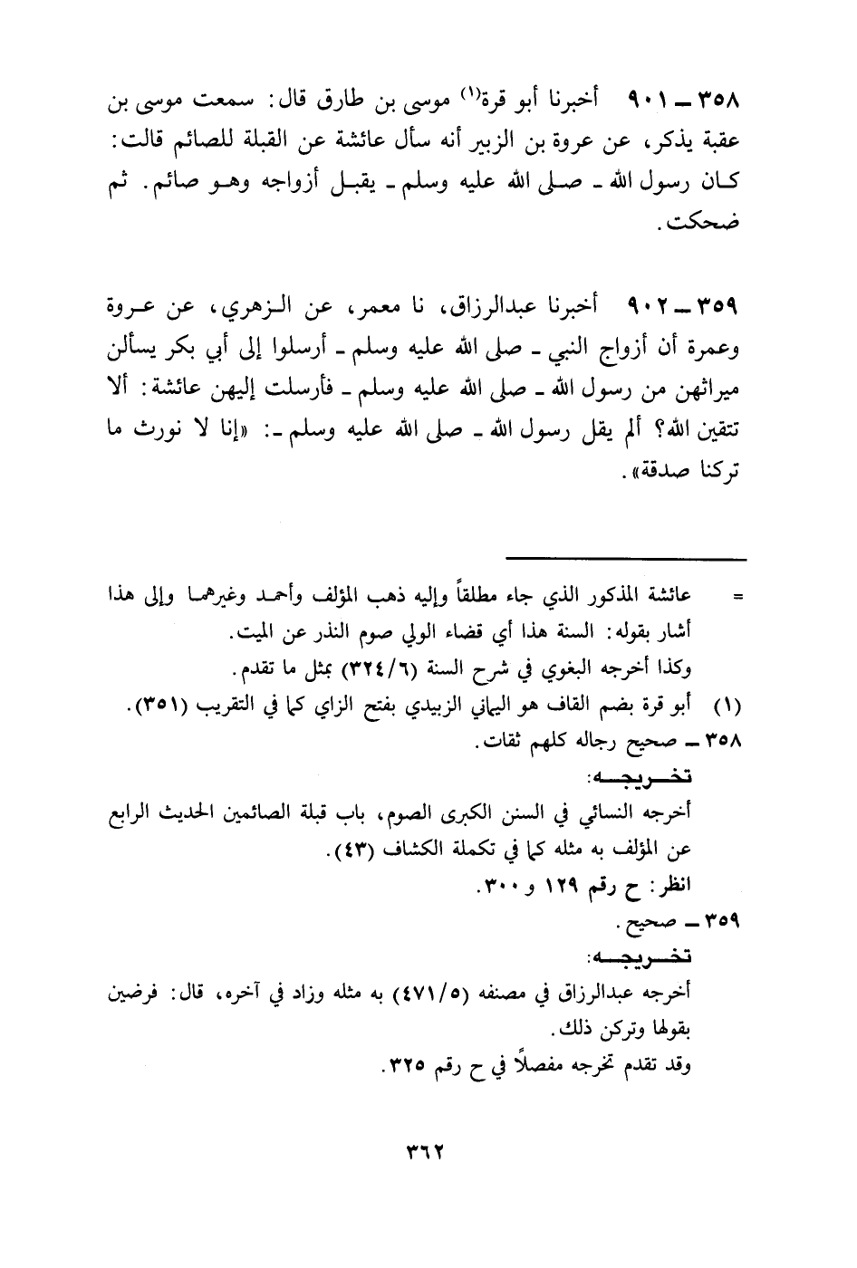 902 - أَخْبَرَنَا عَبْدُ الرَّزَّاقِ، نا مَعْمَرٌ، عَنِ الزُّهْرِيِّ، عَنْ عُرْوَةَ، وَعَمْرَةَ، أَنَّ أَزْوَاجَ النَّبِيِّ صَلَّى اللهُ عَلَيْهِ وَسَلَّمَ أَرْسَلْنَ إِلَى أَبِي بَكْرٍ يَسْأَلْنَ مِيرَاثَهُنَّ مِنْ رَسُولِ اللَّهِ صَلَّى اللهُ عَلَيْهِ وَسَلَّمَ فَأَرْسَلَتْ إِلَيْهِنَّ عَائِشَةُ أَلَا تَتَّقِينَ اللَّهَ أَلَمْ يَقُلْ رَسُولُ اللَّهِ صَلَّى اللهُ عَلَيْهِ وَسَلَّمَ §إِنَّا لَا نُورَثُ مَا تَرَكْنَا صَدَقَةٌ