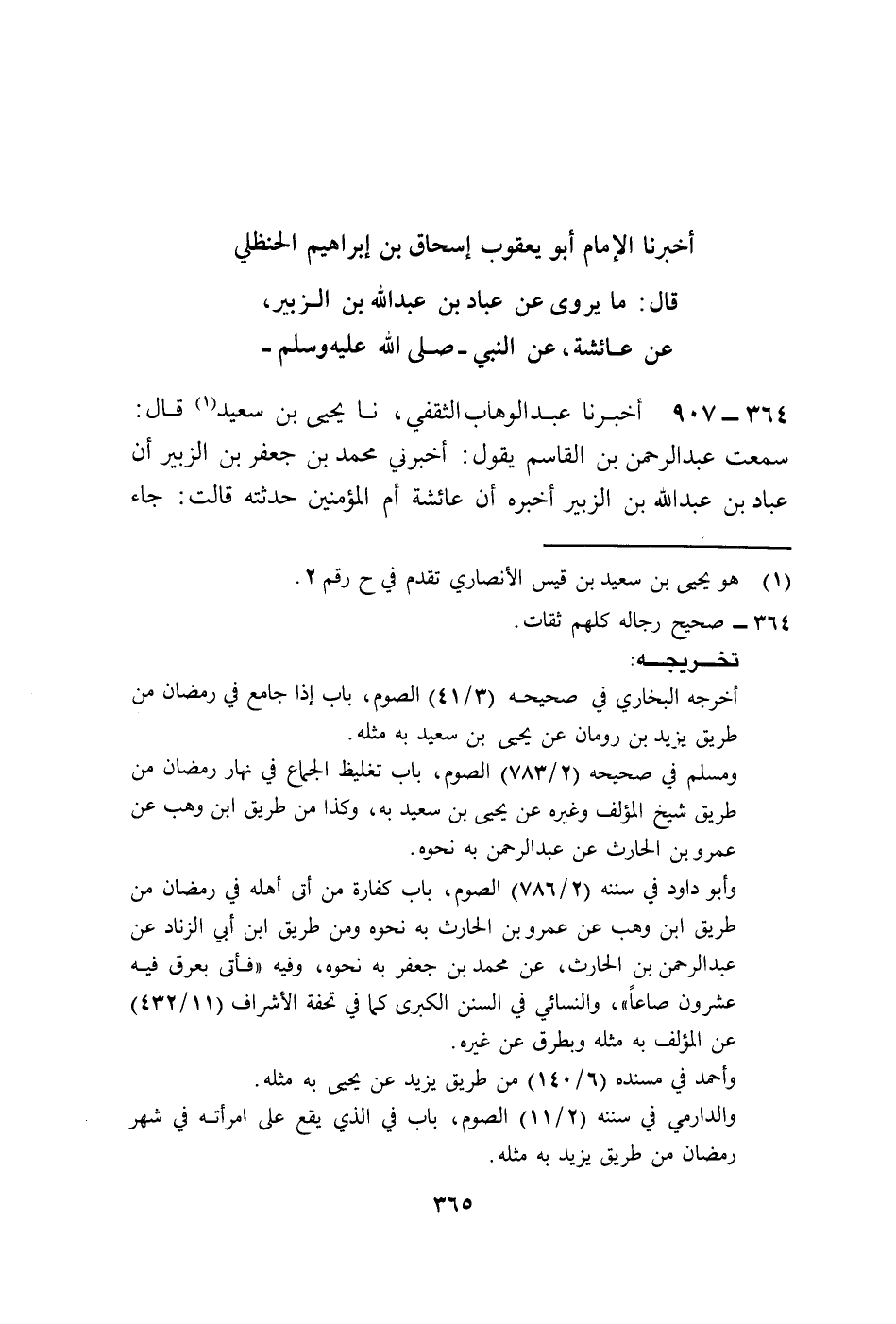 907 - أَخْبَرَنَا عَبْدُ الْوَهَّابِ الثَّقَفِيُّ، نا يَحْيَى بْنُ سَعِيدٍ، قَالَ سَمِعْتُ عَبْدَ الرَّحْمَنِ بْنَ الْقَاسِمِ، يَقُولُ أَخْبَرَنِي مُحَمَّدُ بْنُ جَعْفَرِ بْنِ الزُّبَيْرِ، أَنَّ عَبَّادَ بْنَ عَبْدِ اللَّهِ بْنِ الزُّبَيْرِ، أَخْبَرَهُ أَنَّ عَائِشَةَ أمَّ الْمُؤْمِنِينَ حَدَّثَتْهُ قَالَتْ: جَاءَ رَجُلٌ إِلَى رَسُولِ اللَّهِ صَلَّى اللهُ عَلَيْهِ وَسَلَّمَ فَقَالَ: يَا رَسُولَ اللَّهِ إِنِّي احْتَرَقْتُ فَسَأَلَهُ مَا لَهُ؟ فَقَالَ §أَفْطَرْتُ فِي رَمَضَانَ ثُمَّ جَلَسَ فَأُتِيَ رَسُولَ اللَّهِ صَلَّى اللهُ عَلَيْهِ وَسَلَّمَ بِمِكْتَلٍ عَظِيمٍ يُدْعَى الْعَرَقَ فِيهِ تَمْرٌ فَسَأَلَ رَسُولُ اللَّهِ صَلَّى اللهُ عَلَيْهِ وَسَلَّمَ عَنِ الرَّجُلِ فَقَالَ أَيْنَ الْمُحْتَرِقُ؟ فَقَامَ الرَّجُلُ فَقَالَ تَصَدَّقْ بِهَذَا