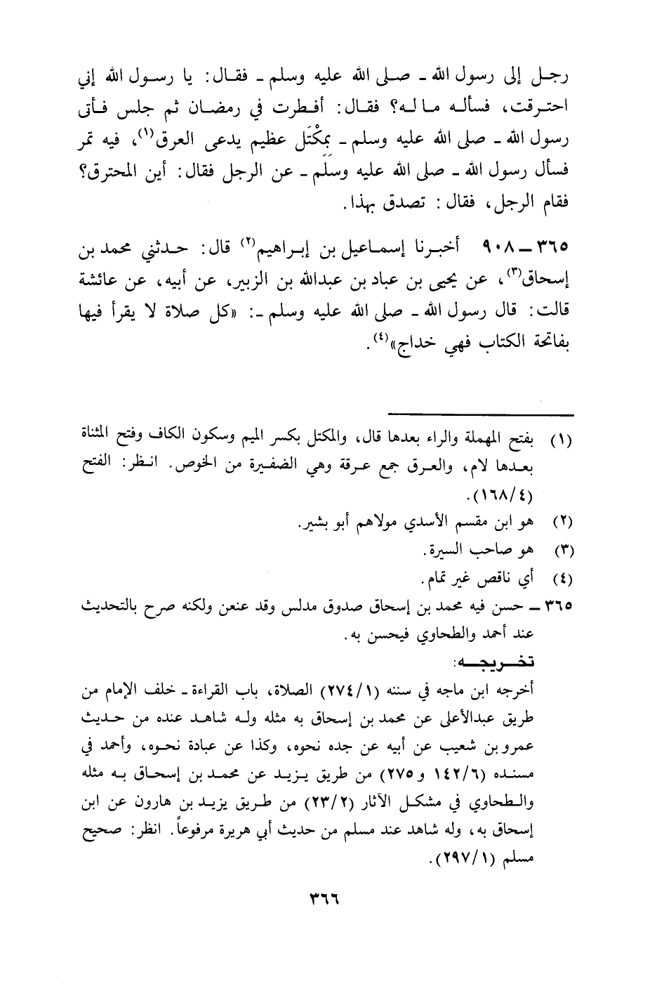 908 - أَخْبَرَنَا إِسْمَاعِيلُ بْنُ إِبْرَاهِيمَ، قَالَ: حَدَّثَنِي مُحَمَّدُ بْنُ إِسْحَاقَ، عَنْ يَحْيَى بْنِ عَبَّادِ بْنِ عَبْدِ اللَّهِ بْنِ الزُّبَيْرِ، عَنْ أَبِيهِ، عَنْ عَائِشَةَ، قَالَتْ قَالَ رَسُولُ اللَّهِ صَلَّى اللهُ عَلَيْهِ وَسَلَّمَ §كُلُّ صَلَاةٍ لَا يُقْرَأُ فِيهَا بِفَاتِحَةِ الْكِتَابِ فَهِيَ خِدَاجٌ