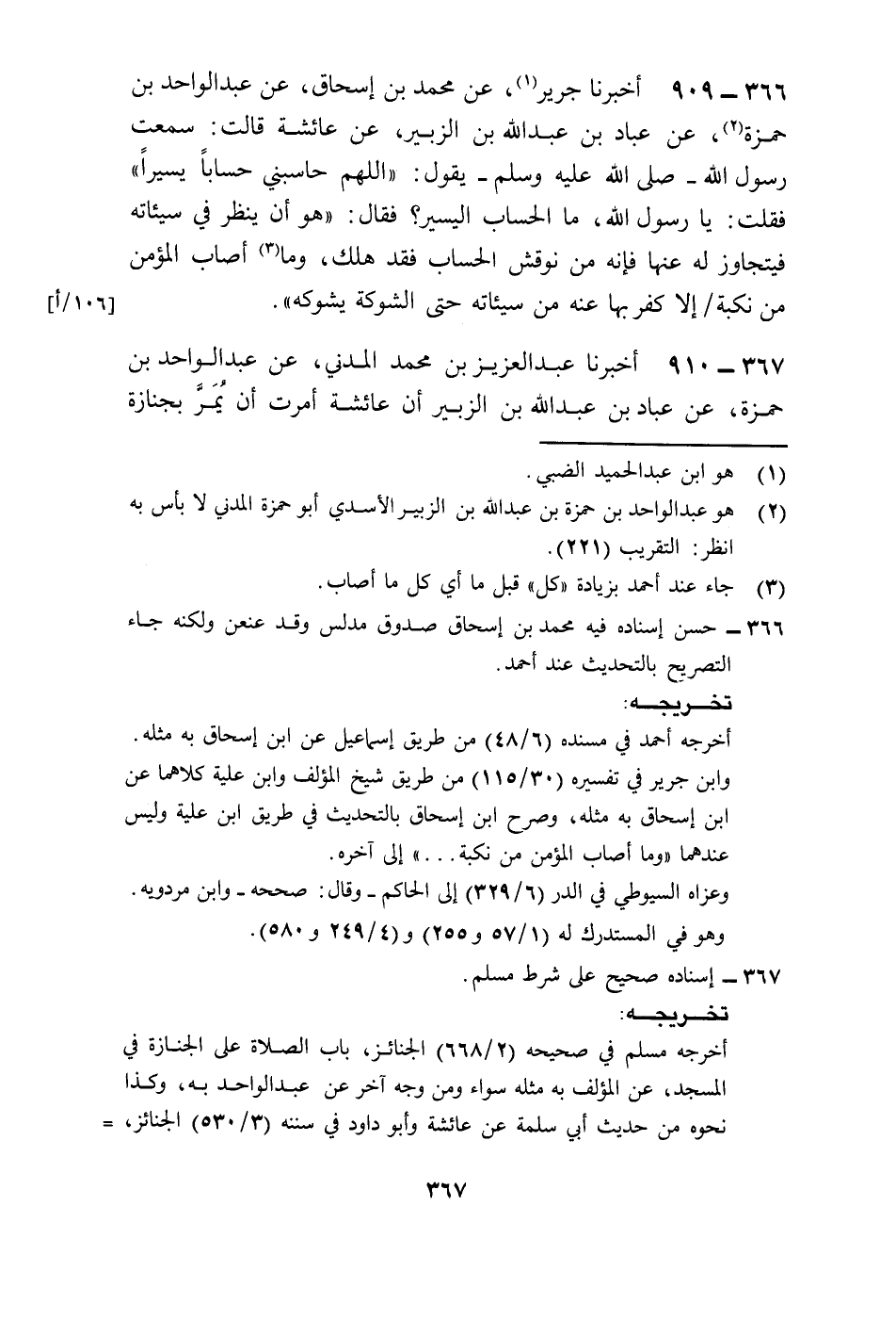 909 - أَخْبَرَنَا جَرِيرٌ، عَنْ مُحَمَّدِ بْنِ إِسْحَاقَ، عَنْ عَبْدِ الْوَاحِدِ بْنِ حَمْزَةَ، عَنْ عَبَّادِ بْنِ عَبْدِ اللَّهِ بْنِ الزُّبَيْرِ، عَنْ عَائِشَةَ، قَالَتْ: سَمِعْتُ رَسُولَ اللَّهِ صَلَّى اللهُ عَلَيْهِ وَسَلَّمَ يَقُولُ: «§اللَّهُمَّ حَاسِبْنِي حِسَابًا يَسِيرًا» فَقُلْتُ: يَا رَسُولَ اللَّهِ مَا الْحِسَابُ الْيَسِيرُ؟ فَقَالَ هُوَ أَنْ يَنْظُرَ فِي سَيِّئَاتِهِ فَيَتَجَاوَزَ لَهُ عَنْهَا فَإِنَّهُ مَنْ نُوقِشَ الْحِسَابَ فَقَدْ هَلَكَ وَمَا أَصَابَ الْمُؤْمِنَ مِنْ نَكْبَةٍ إِلَّا كَفَّرَ بِهَا عَنْهُ مِنْ سَيِّئَاتِهِ حَتَّى الشَّوْكَةِ يَشُوكُهُ