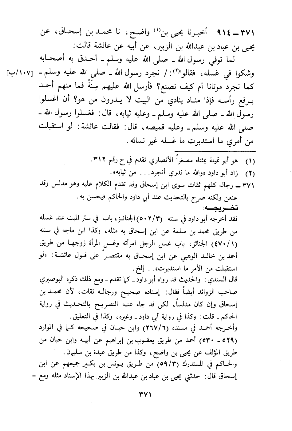914 - أَخْبَرَنَا يَحْيَى بْنُ وَاضِحٍ، نا مُحَمَّدُ بْنُ إِسْحَاقَ، عَنْ يَحْيَى بْنِ عَبَّادِ بْنِ عَبْدِ اللَّهِ بْنِ الزُّبَيْرِ، عَنْ أَبِيهِ، عَنْ عَائِشَةَ، قَالَتْ: لَمَّا تُوُفِّي رَسُولُ اللَّهِ صَلَّى اللهُ عَلَيْهِ وَسَلَّمَ أَحْدَقَ بِهِ أَصْحَابُهُ وَشَكُّوا فِي غُسْلِهِ فَقَالُوا نُجَرِّدُ رَسُولَ اللَّهِ صَلَّى اللهُ عَلَيْهِ وَسَلَّمَ كَمَا نُجَرِّدُ مَوْتَانَا أَمْ كَيْفَ نَصْنَعُ؟ فَأَرْسَلَ اللَّهُ إِلَيْهِمْ سِنَةً فَمَا مِنْهُمْ أَحَدٌ يَرْفَعُ رَأْسَهُ فَإِذَا مُنَادٍ يُنَادِي مِنَ الْبَيْتِ لَا يَدْرُونَ مَنْ هُوَ أَنِ §اغْسِلُوا رَسُولَ اللَّهِ صَلَّى اللهُ عَلَيْهِ وَسَلَّمَ وَعَلَيْهِ ثِيَابُهُ قَالَ فَغَسَّلُوا رَسُولَ اللَّهِ صَلَّى اللهُ عَلَيْهِ وَسَلَّمَ وَعَلَيْهِ قَمِيصُهُ قَالَ فَقَالَتْ عَائِشَةُ: لَوِ اسْتَقْبَلْتُ مِنْ أَمْرِي مَا اسْتَدْبَرْتُ مَا غَسَّلَهُ غَيْرُ نِسَائِهِ