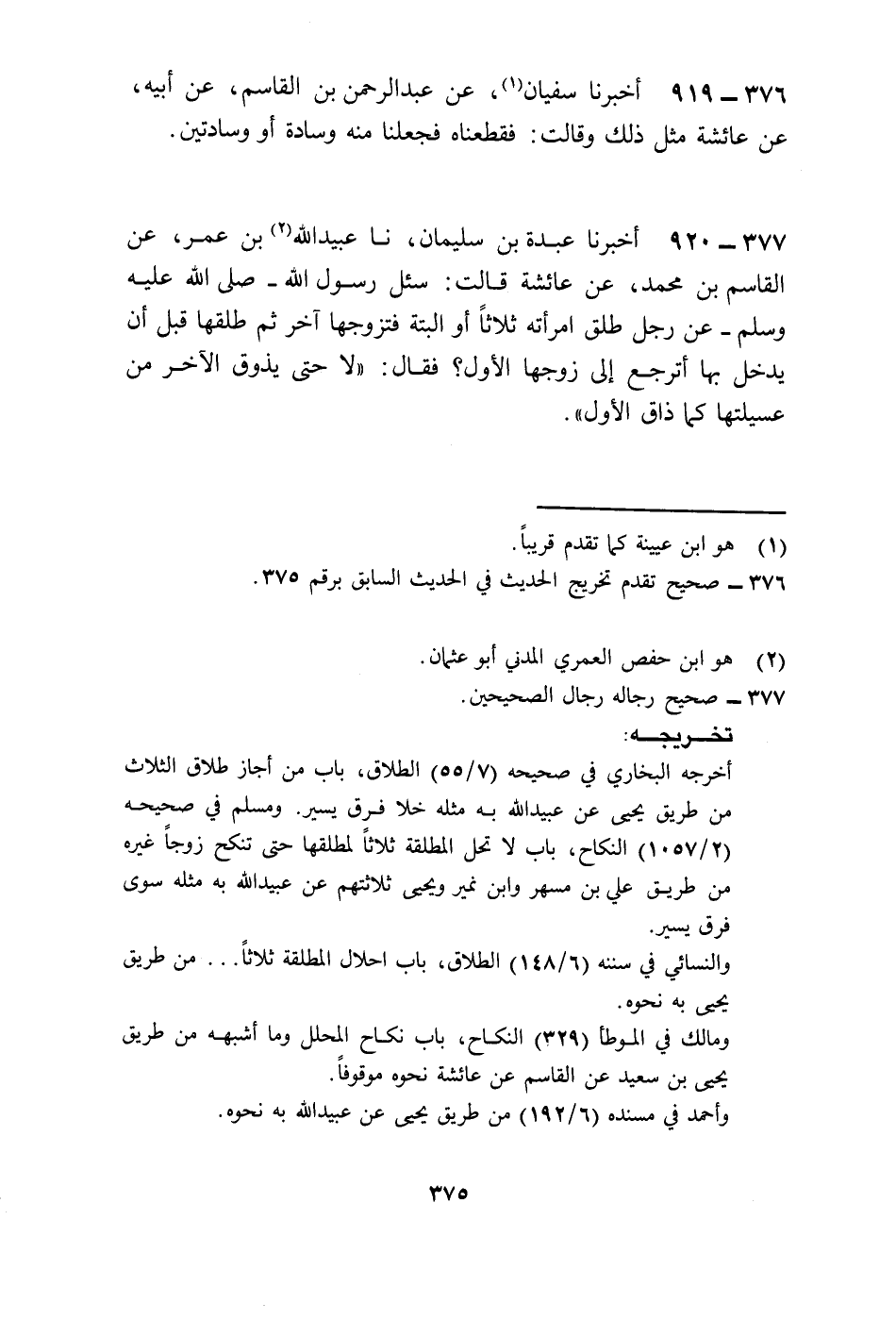 920 - أَخْبَرَنَا عَبْدَةُ بْنُ سُلَيْمَانَ، نا عُبَيْدُ اللَّهِ بْنُ عُمَرَ، عَنِ الْقَاسِمِ بْنِ مُحَمَّدٍ، عَنْ عَائِشَةَ، قَالَتْ سُئِلَ رَسُولُ اللَّهِ صَلَّى اللهُ عَلَيْهِ وَسَلَّمَ عَنْ رَجُلٍ طَلَّقَ امْرَأَتَهُ ثَلَاثًا أَوِ الْبَتَّةَ فَتَزَوَّجَهَا آخَرُ ثُمَّ طَلَّقَهَا قَبْلَ أَنْ يَدْخُلَ بِهَا أَتَرْجِعُ إِلَى زَوْجِهَا الْأَوَّلِ فَقَالَ لَا §حَتَّى يَذُوقُ الْآخَرُ مِنْ عُسَيْلَتِهَا كَمَا ذَاقَ الْأَوَّلُ