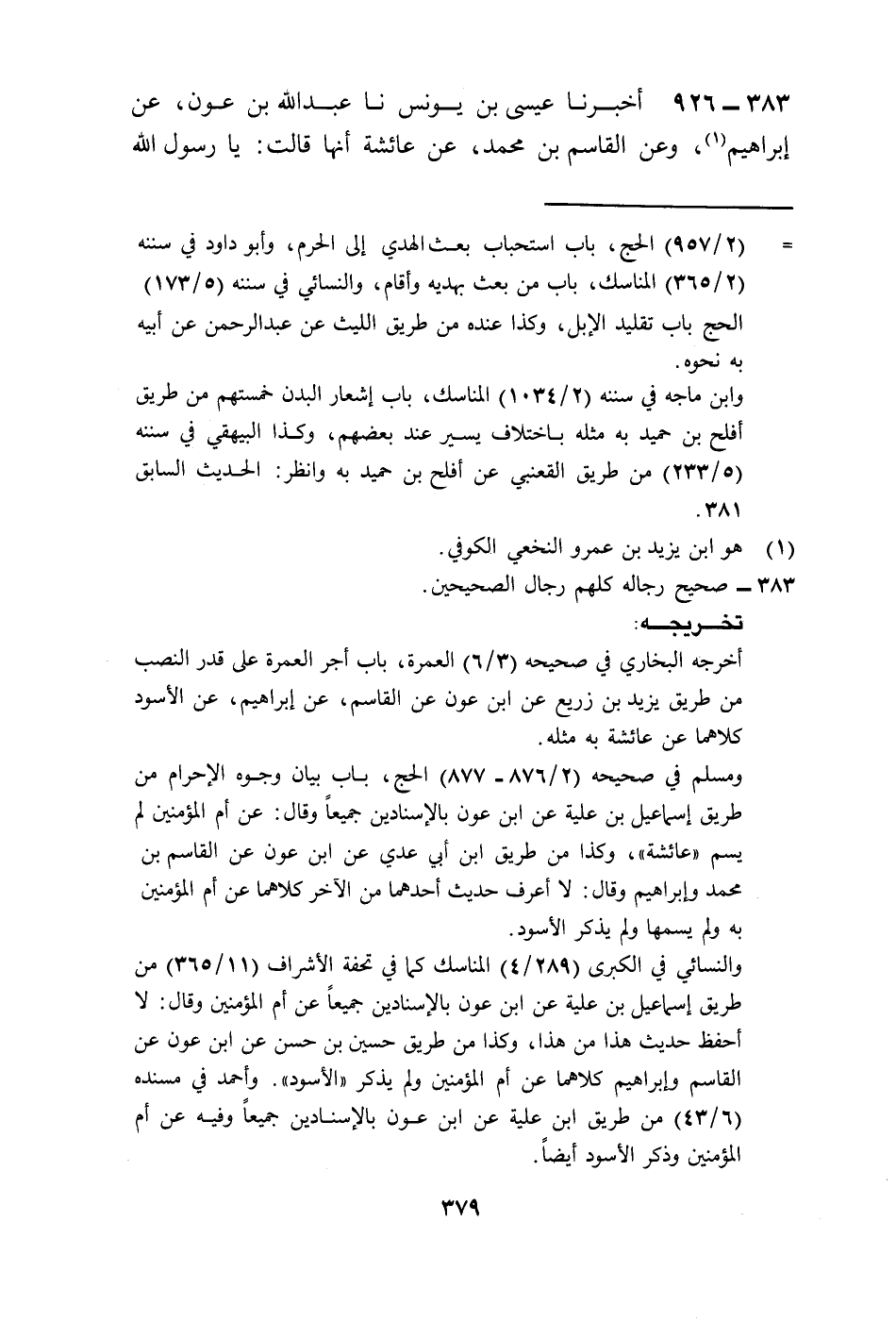 926 - أَخْبَرَنَا عِيسَى بْنُ يُونُسَ، نا عَبْدُ اللَّهِ بْنُ عَوْنٍ، عَنْ إِبْرَاهِيمَ، وَعَنِ الْقَاسِمِ بْنِ مُحَمَّدٍ، عَنْ عَائِشَةَ، أَنَّهَا قَالَتْ: يَا رَسُولَ اللَّهِ أَيَرْجِعُ النَّاسُ بِنُسُكَيْنِ وَأَرْجِعُ بِنُسُكٍ وَاحِدٍ فَقَالَ لَهَا رَسُولُ اللَّهِ صَلَّى اللهُ عَلَيْهِ وَسَلَّمَ: " انْتَظِرِي حَتَّى §إِذَا تَطَهَّرْتِ خَرَجْتِ إِلَى التَّنْعِيمِ وَأَهْلَلْتِ بِعُمْرَةٍ مِنْ ثَمَّ وَلَكِنَّهَا عَلَى قَدْرِ نَفَقَتِكِ أَوْ نَصَبِكِ شَكَّ ابْنُ عَوْنٍ