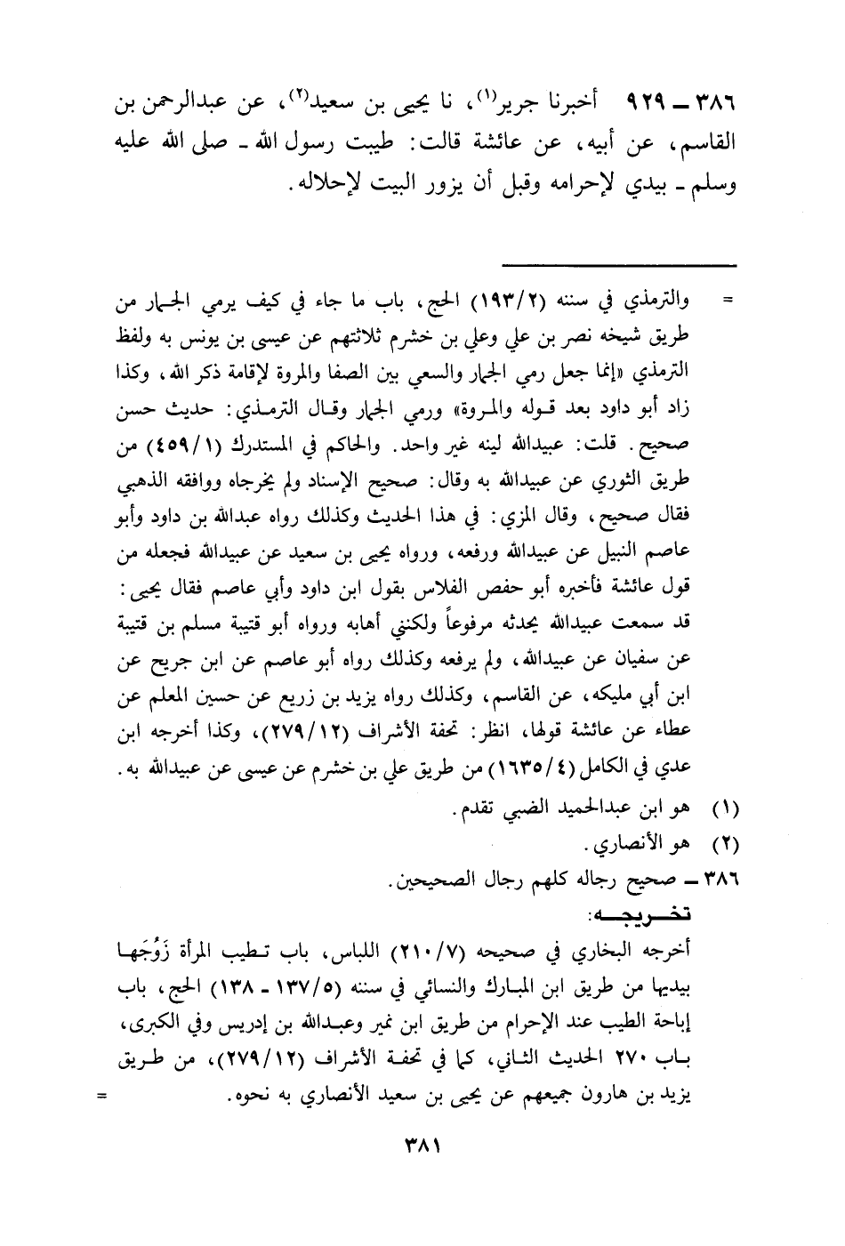 929 - أَخْبَرَنَا جَرِيرٌ، نا يَحْيَى بْنُ سَعِيدٍ، عَنْ عَبْدِ الرَّحْمَنِ بْنِ الْقَاسِمِ، عَنْ أَبِيهِ، عَنْ عَائِشَةَ، قَالَتْ: §طَيَّبْتُ رَسُولَ اللَّهِ صَلَّى اللهُ عَلَيْهِ وَسَلَّمَ بِيَدِي لِإِحْرَامِهِ وَقَبْلَ أَنْ يَزُورَ الْبَيْتَ لِإِحْلَالِهِ