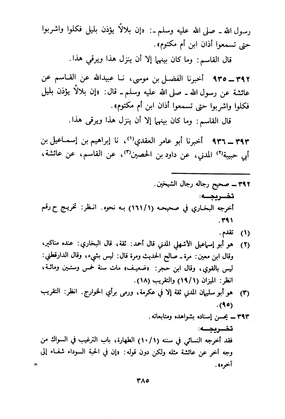 935 - أَخْبَرَنَا الْفَضْلُ بْنُ مُوسَى، نا عُبَيْدُ اللَّهِ، عَنِ الْقَاسِمِ، عَنْ عَائِشَةَ، عَنْ رَسُولِ اللَّهِ صَلَّى اللهُ عَلَيْهِ وَسَلَّمَ قَالَ: «إِنَّ §بِلَالًا يُؤَذِّنُ بِلَيْلٍ فَكُلُوا وَاشْرَبُوا حَتَّى تَسْمَعُوا أَذَانَ ابْنِ أُمِّ مَكْتُومٍ» قَالَ الْقَاسِمُ: وَمَا كَانَ بَيْنَهُمَا إِلَّا أَنْ يَنْزِلَ هَذَا وَيَرْقَى هَذَا