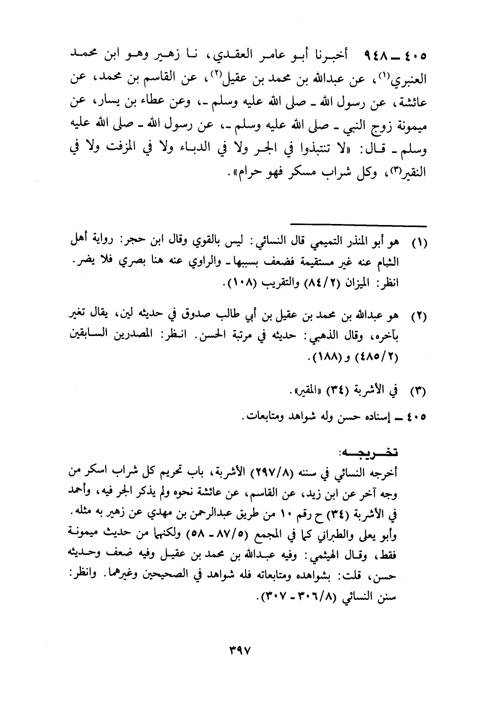 948 - أَخْبَرَنَا أَبُو عَامِرٍ الْعَقَدِيُّ، نا زُهَيْرٌ وَهُوَ ابْنُ مُحَمَّدٍ الْعَنْبَرِيُّ عَنْ عَبْدِ اللَّهِ بْنِ مُحَمَّدِ بْنِ عُقَيْلٍ، عَنِ الْقَاسِمِ بْنِ مُحَمَّدٍ، عَنْ عَائِشَةَ، عَنْ رَسُولِ اللَّهِ صَلَّى اللهُ عَلَيْهِ وَسَلَّمَ وَعَنْ عَطَاءِ بْنِ يَسَارٍ عَنْ مَيْمُونَةَ زَوْجِ النَّبِيِّ صَلَّى اللهُ عَلَيْهِ وَسَلَّمَ عَنْ رَسُولِ اللَّهِ صَلَّى اللهُ عَلَيْهِ وَسَلَّمَ قَالَ: «§لَا تَنْتَبِذُوا فِي الْجَرِّ وَلَا فِي الدُّبَّاءِ وَلَا فِي الْمُزَفَّتِ وَلَا فِي النَّقِيرِ وَكُلُّ شَرَابٍ مُسْكِرٌ فَهُوَ حَرَامٌ»