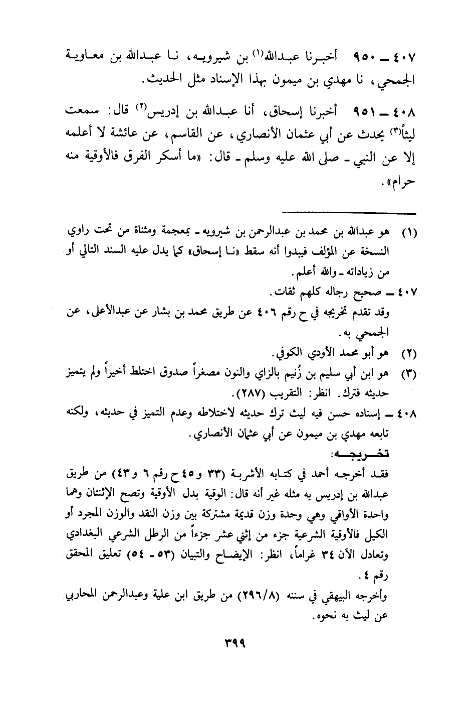 951 - أَخْبَرَنَا إِسْحَاقُ، أنا عَبْدُ اللَّهِ بْنُ إِدْرِيسَ، قَالَ سَمِعْتُ لَيْثَا، يُحَدِّثُ عَنْ أَبِي عُثْمَانَ الْأَنْصَارِيِّ، عَنِ الْقَاسِمِ، عَنْ عَائِشَةَ، لَا أَعْلَمُهُ إِلَّا عَنِ النَّبِيِّ صَلَّى اللهُ عَلَيْهِ وَسَلَّمَ قَالَ: «§مَا أَسْكَرَ الْفَرَقُ فَالْأُوقِيَّةُ مِنْهُ حَرَامٌ»