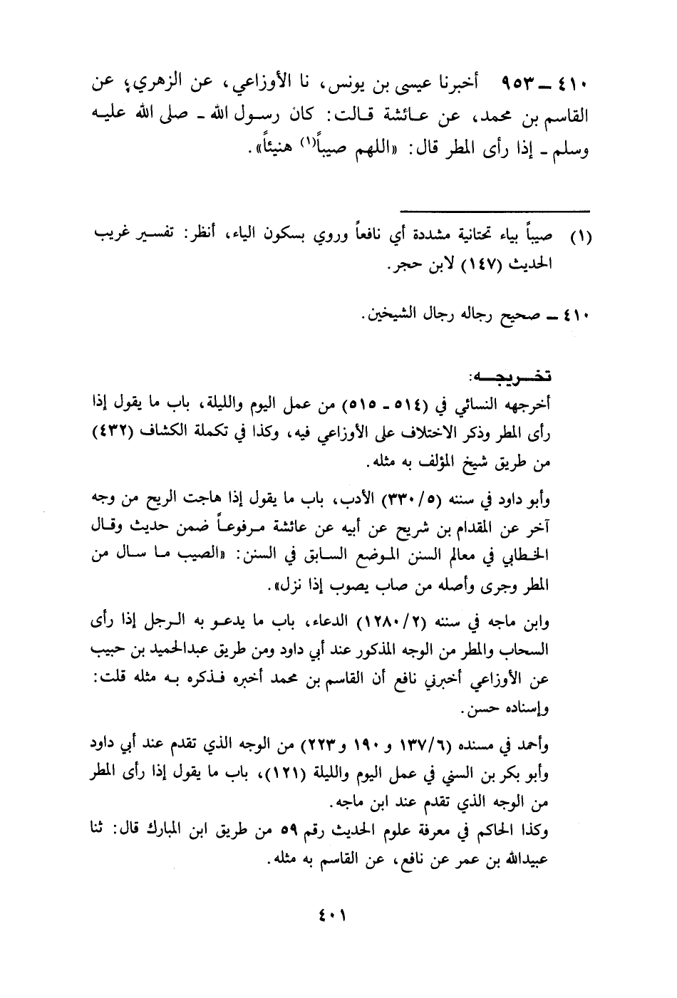953 - أَخْبَرَنَا عِيسَى بْنُ يُونُسَ، نا الْأَوْزَاعِيُّ، عَنِ الزُّهْرِيِّ، عَنِ الْقَاسِمِ بْنِ مُحَمَّدٍ، عَنْ عَائِشَةَ، قَالَتْ: كَانَ رَسُولُ اللَّهِ صَلَّى اللهُ عَلَيْهِ وَسَلَّمَ §إِذَا رَأَى الْمَطَرَ قَالَ: «اللَّهُمَّ صَيِّبًا هَنِيئًا»