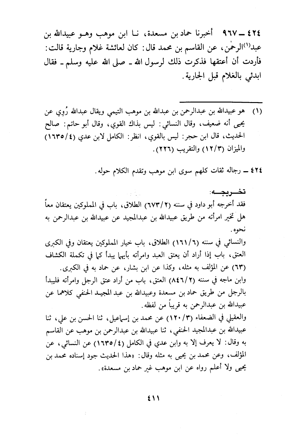 967 - أَخْبَرَنَا حَمَّادُ بْنُ مَسْعَدَةَ، نا ابْنُ مَوْهَبٍ وَهُوَ عُبَيْدُ اللَّهِ بْنُ عَبْدِ الرَّحْمَنِ عَنِ الْقَاسِمِ بْنِ مُحَمَّدٍ، قَالَ كَانَ لِعَائِشَةَ غُلَامٌ وَجَارِيَةٌ قَالَتْ: فَأَرَدْتُ أَنْ أَعْتِقَهَا فَذَكَرْتُ ذَلِكَ لِرَسُولِ اللَّهِ صَلَّى اللهُ عَلَيْهِ وَسَلَّمَ فَقَالَ: «§ابْدَئِي بِالْغُلَامِ قَبْلَ الْجَارِيَةِ»