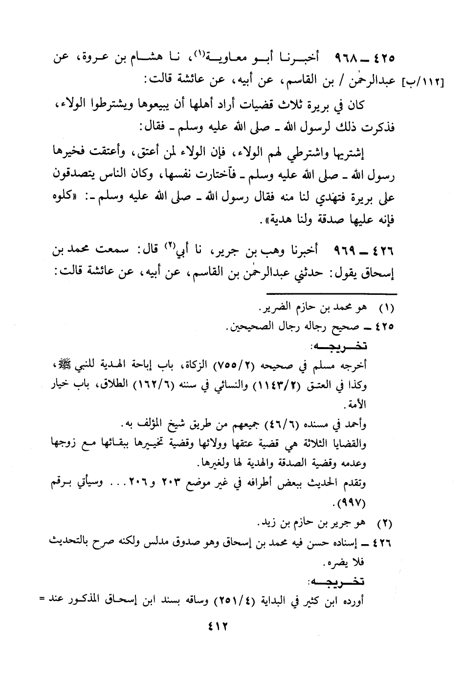 968 - أَخْبَرَنَا أَبُو مُعَاوِيَةَ، نا هِشَامُ بْنُ عُرْوَةَ، عَنْ عَبْدِ الرَّحْمَنِ بْنِ الْقَاسِمِ، عَنْ أَبِيهِ، عَنْ عَائِشَةَ، قَالَتْ: كَانَ فِي بَرِيرَةَ ثَلَاثُ قَضِيَّاتٍ أَرَادَ أَهْلُهَا أَنْ يَبِيعُوهَا وَيَشْتَرِطُوا الْوَلَاءَ فَذَكَرْتُ ذَلِكَ لِرَسُولِ اللَّهِ صَلَّى اللهُ عَلَيْهِ وَسَلَّمَ فَقَالَ: «§اشْتَرِيهَا وَاشْتَرِطِي لَهُمُ الْوَلَاءَ فَإِنَّ الْوَلَاءَ لِمَنْ أَعْتَقَ» وَأُعْتِقَتْ فَخَيَّرَهَا رَسُولُ اللَّهِ صَلَّى اللهُ عَلَيْهِ وَسَلَّمَ فَاخْتَارَتْ نَفْسَهَا وَكَانَ النَّاسُ يَتَصَدَّقُونَ عَلَى بَرِيرَةَ فَتُهْدِي لَنَا مِنْهُ فَقَالَ رَسُولُ اللَّهِ صَلَّى اللهُ عَلَيْهِ وَسَلَّمَ: «كُلُوهُ فَإِنَّهُ عَلَيْهَا صَدَقَةٌ وَلَنَا هَدِيَّةٌ»