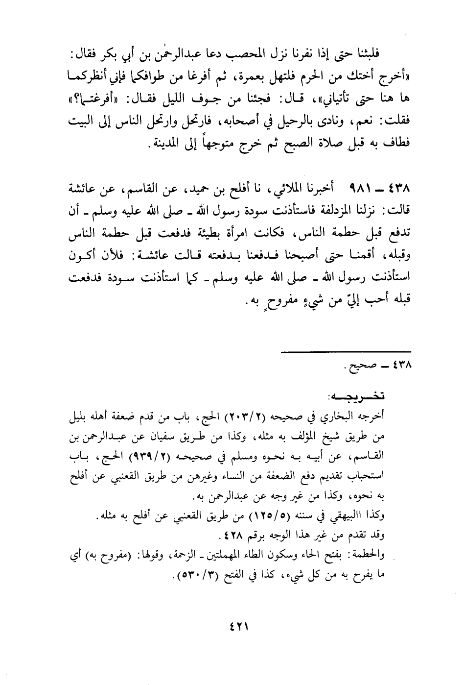 981 - أَخْبَرَنَا الْمُلَائِيُّ، نا أَفْلَحُ بْنُ حُمَيْدٍ، عَنِ الْقَاسِمِ، عَنْ عَائِشَةَ، قَالَتْ: نَزَلْنَا الْمُزْدِلِفَةَ فَاسْتَأْذَنَتْ سَوْدَةُ رَسُولَ اللَّهِ صَلَّى اللهُ عَلَيْهِ وَسَلَّمَ أَنْ §تَدْفَعَ قَبْلَ حَطْمَةِ النَّاسِ فَكَانَتِ امْرَأَةً بَطِيئَةً فَدَفَعَتْ قَبْلَ حَطْمَةِ النَّاسِ وَقَبْلَهُ أَقَمْنَا حَتَّى أَصْبَحْنَا فَدَفَعْنَا بِدَفْعَتِهِ قَالَتْ عَائِشَةُ: فَلَأَنْ أَكُونَ اسْتَأْذَنْتُ رَسُولَ اللَّهِ صَلَّى اللهُ عَلَيْهِ وَسَلَّمَ كَمَا اسْتَأْذَنَتْ سَوْدَةُ فَدَفَعْتُ قَبْلَهُ أَحَبُّ إِلَيَّ مِنْ شَيْءٍ مَفْرُوحٍ بِهِ "