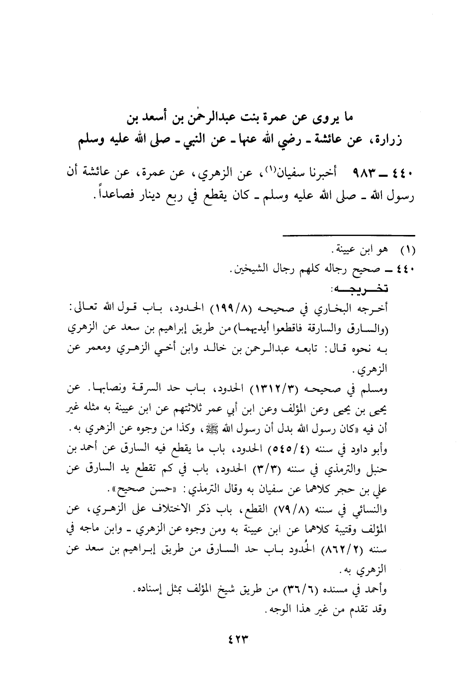 983 - أَخْبَرَنَا سُفْيَانُ، عَنِ الزُّهْرِيِّ، عَنْ عَمْرَةَ، عَنْ عَائِشَةَ، أَنَّ رَسُولَ اللَّهِ صَلَّى اللهُ عَلَيْهِ وَسَلَّمَ «كَانَ §يَقْطَعُ فِي رُبُعِ دِينَارٍ فَصَاعِدًا»