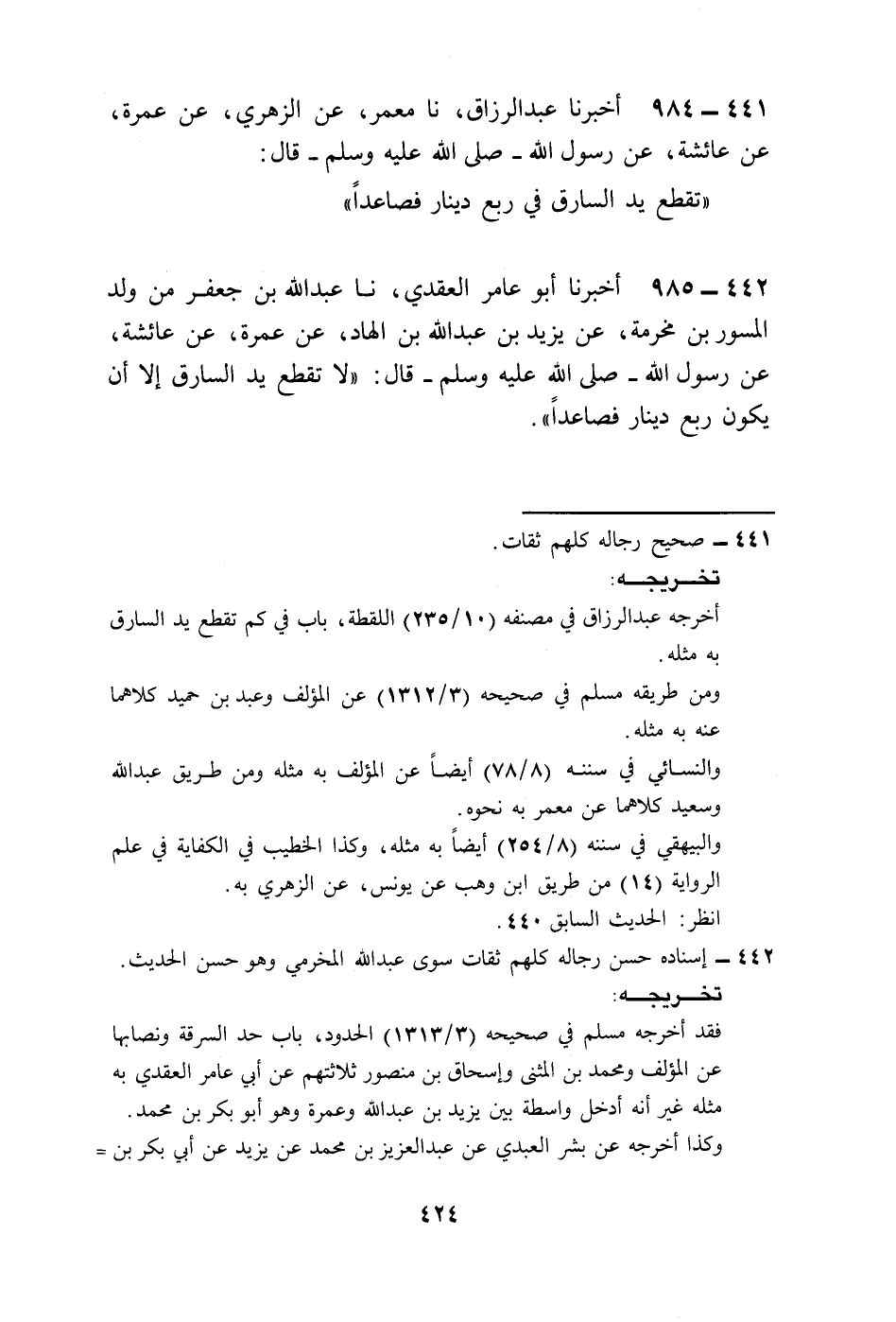 985 - أَخْبَرَنَا أَبُو عَامِرٍ الْعَقَدِيُّ، نا عَبْدُ اللَّهِ بْنُ جَعْفَرٍ مِنْ وَلَدِ الْمِسْوَرِ بْنِ مَخْرَمَةَ عَنْ يَزِيدَ بْنِ عَبْدِ اللَّهِ بْنِ الْهَادِ، عَنْ عَمْرَةَ، عَنْ عَائِشَةَ، عَنْ رَسُولِ اللَّهِ صَلَّى اللهُ عَلَيْهِ وَسَلَّمَ قَالَ: «§لَا تُقْطَعُ يَدُ السَّارِقِ إِلَّا أَنْ يَكُونَ رُبْعَ دِينَارٍ فَصَاعِدًا»
