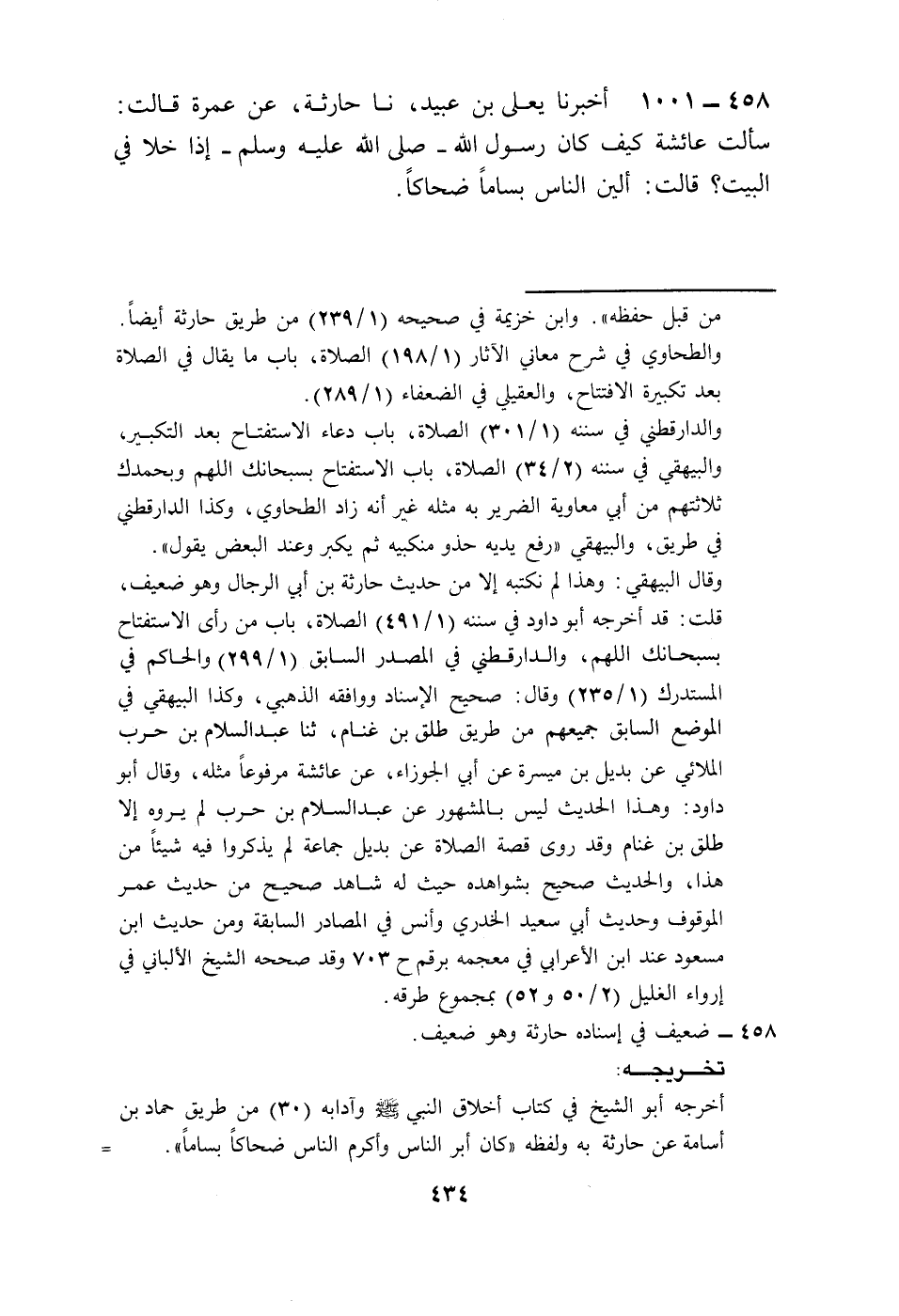 1001 - أَخْبَرَنَا يَعْلَى بْنُ عُبَيْدٍ، نا حَارِثَةُ، عَنْ عَمْرَةَ، قَالَتْ: سَأَلْتُ عَائِشَةَ كَيْفَ كَانَ رَسُولُ اللَّهِ صَلَّى اللهُ عَلَيْهِ وَسَلَّمَ §إِذَا خَلَا فِي الْبَيْتِ؟ قَالَتْ: أَلْيَنَ النَّاسِ بَسَّامًا ضَحَّاكًا "