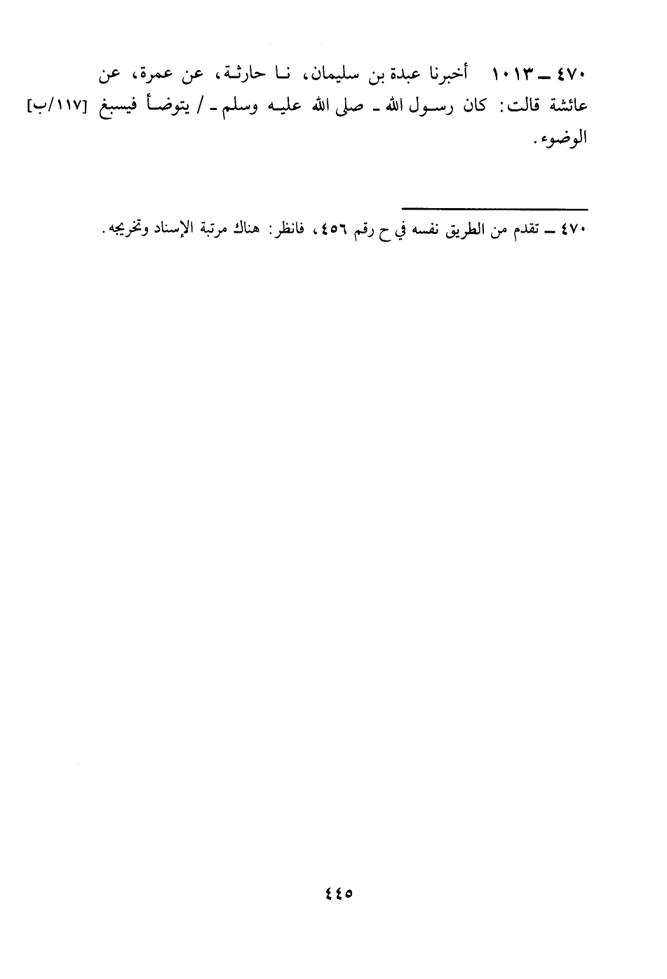 1013 - أَخْبَرَنَا عَبْدَةُ بْنُ سُلَيْمَانَ، نا حَارِثَةُ، عَنْ عَمْرَةَ، عَنْ عَائِشَةَ، قَالَتْ: كَانَ رَسُولُ اللَّهِ صَلَّى اللهُ عَلَيْهِ وَسَلَّمَ «§يَتَوَضَّأُ فَيُسْبِغُ الْوُضُوءَ»
