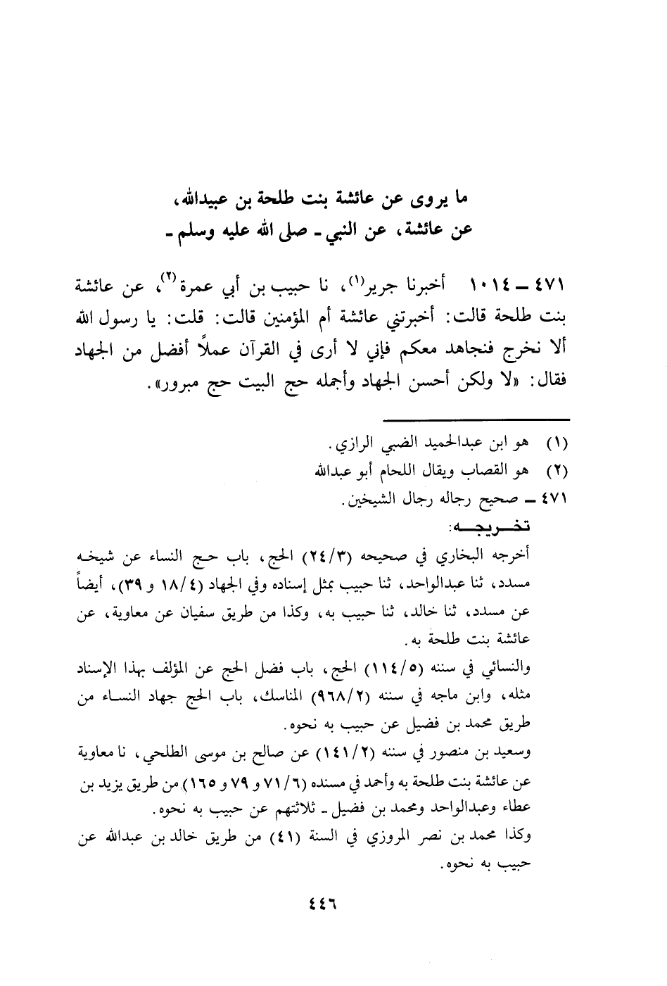 1014 - أَخْبَرَنَا جَرِيرٌ، نا حَبِيبُ بْنُ أَبِي عَمْرَةَ، عَنْ عَائِشَةَ بِنْتِ طَلْحَةَ، قَالَتْ: أَخْبَرَتْنِي عَائِشَةُ أمُّ الْمُؤْمِنِينَ، قَالَتْ: قُلْتُ: يَا رَسُولَ اللَّهِ أَلَا نَخْرُجُ فَنُجَاهِدُ مَعَكُمْ فَإِنِّي لَا أَرَى فِي الْقُرْآنِ عَمَلًا أَفْضَلَ مِنَ الْجِهَادِ فَقَالَ: «لَا وَلَكِنْ §أَحْسَنُ الْجِهَادِ وَأَجْمَلُهُ حَجُّ الْبَيْتِ، حَجٌّ مَبْرُورٌ»
