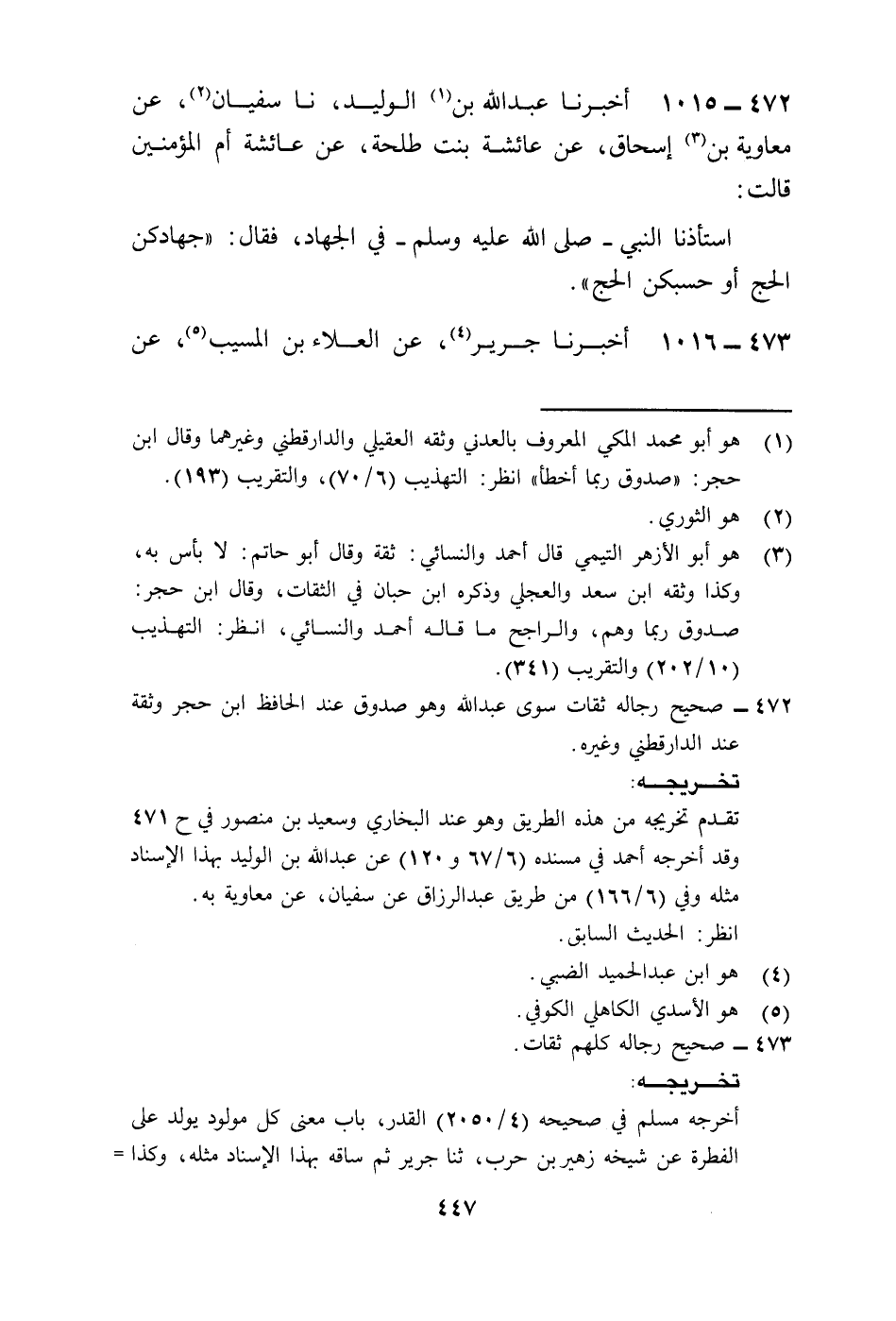 1015 - أَخْبَرَنَا عَبْدُ اللَّهِ بْنُ الْوَلِيدِ، نا سُفْيَانُ، عَنْ مُعَاوِيَةَ بْنِ إِسْحَاقَ، عَنْ عَائِشَةَ بِنْتِ طَلْحَةَ، عَنْ عَائِشَةَ أُمِّ الْمُؤْمِنِينَ، قَالَتْ: اسْتَأْذَنَّا النَّبِيَّ صَلَّى اللهُ عَلَيْهِ وَسَلَّمَ فِي الْجِهَادِ فَقَالَ: «§جِهَادُكُنَّ الْحَجُّ أَوْ حَسْبُكُنَّ الْحَجُّ»