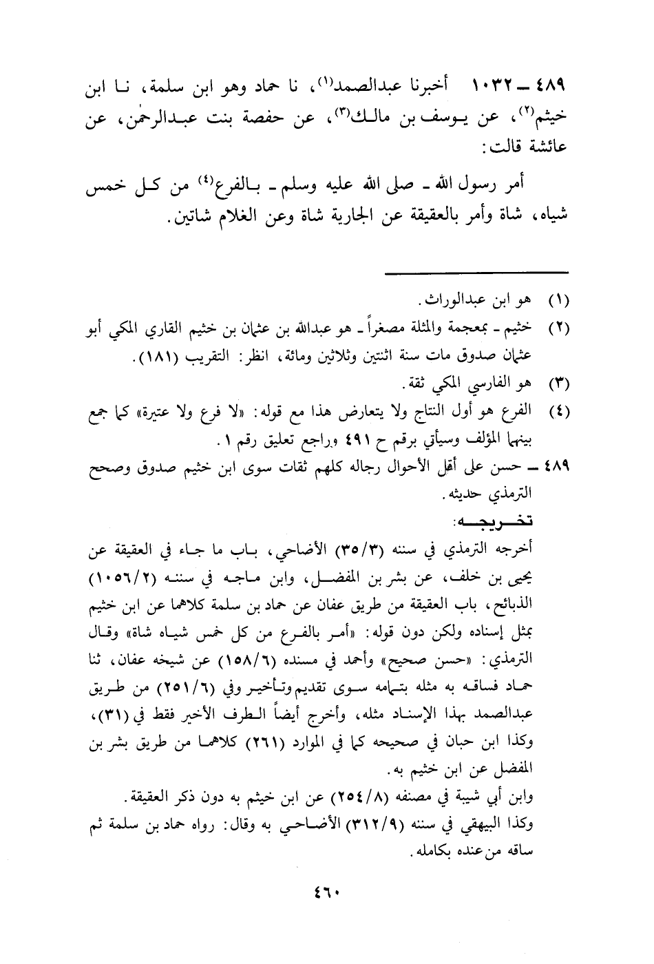 1032 - أَخْبَرَنَا عَبْدُ الصَّمَدِ، نا حَمَّادٌ وَهُوَ ابْنُ سَلَمَةَ نا ابْنُ خَيْثَمِ، عَنْ يُوسُفَ بْنِ مَاهَكَ، عَنْ حَفْصَةَ بِنْتِ عَبْدِ الرَّحْمَنِ، عَنْ عَائِشَةَ، قَالَتْ: «أَمَرَ رَسُولُ اللَّهِ صَلَّى اللهُ عَلَيْهِ وَسَلَّمَ بِالْفَرَعِ مِنْ كُلِّ خَمْسِ شِيَاهٍ شَاةٌ، §وَأَمَرَ بِالْعَقِيقَةِ عَنِ الْجَارِيَةِ شَاةٍ، وَعَنِ الْغُلَامِ شَاتَيْنِ»