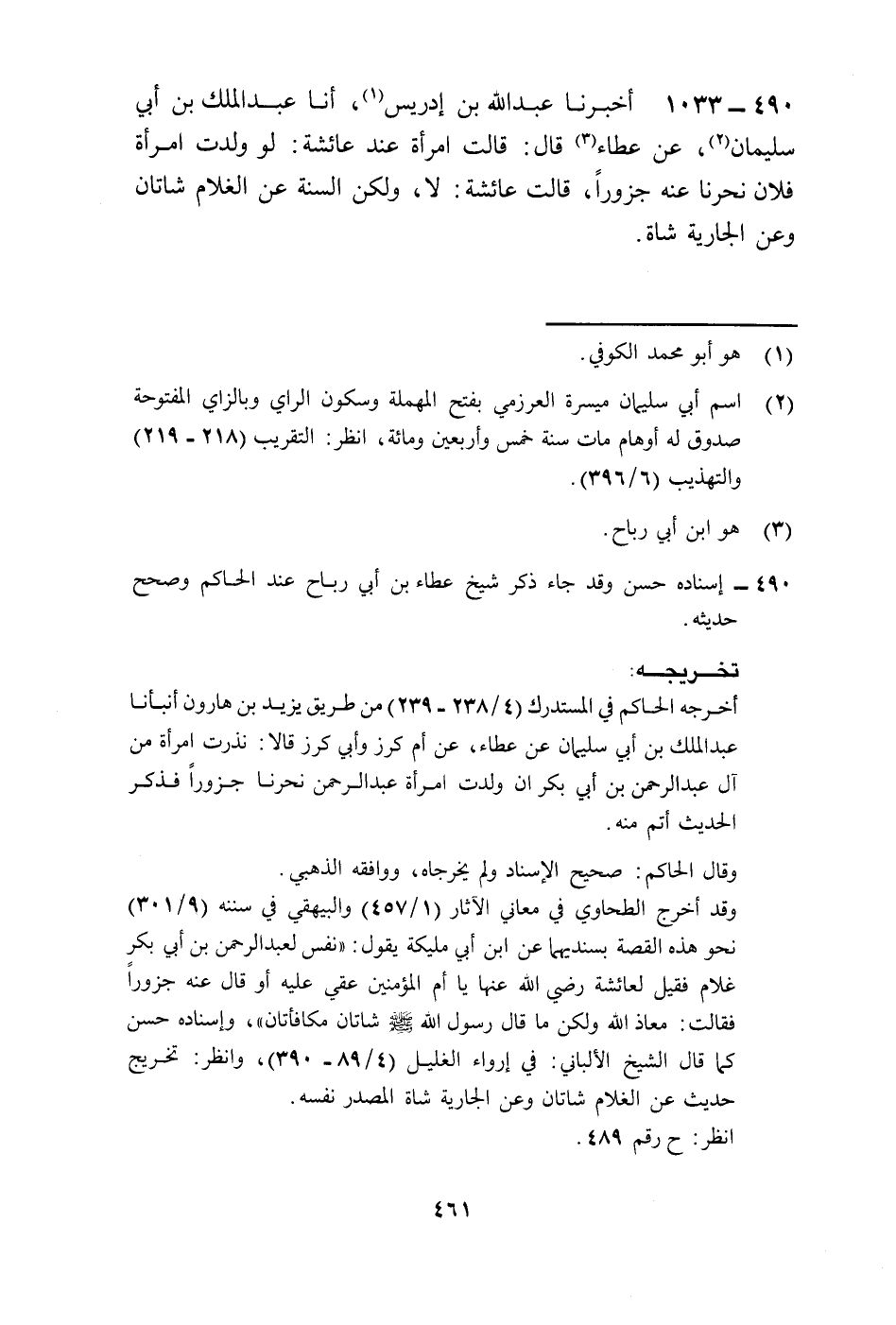 1033 - أَخْبَرَنَا عَبْدُ اللَّهِ بْنُ إِدْرِيسَ، أنا عَبْدُ الْمَلِكِ بْنُ أَبِي سُلَيْمَانَ، عَنْ عَطَاءٍ، قَالَ: قَالَتِ امْرَأَةٌ عِنْدَ عَائِشَةَ: لَوْ وَلَدَتِ امْرَأَةُ فُلَانٍ نَحَرْنَا عَنْهُ جَزُورًا قَالَتْ عَائِشَةُ: «لَا وَلَكِنَّ السُّنَّةَ §عَنِ الْغُلَامِ شَاتَانِ وَعَنِ الْجَارِيَةِ شَاةٌ»