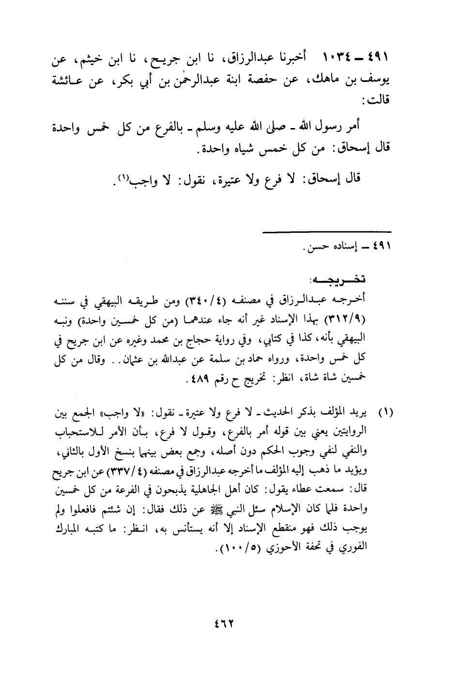 1034 - أَخْبَرَنَا عَبْدُ الرَّزَّاقِ، نا ابْنُ جُرَيْجٍ، نا ابْنُ خُثَيْمٍ، عَنْ يُوسُفَ بْنِ مَاهَكَ، عَنْ حَفْصَةَ ابْنَةِ عَبْدِ الرَّحْمَنِ بْنِ أَبِي بَكْرٍ، عَنْ عَائِشَةَ، قَالَتْ: «§أَمَرَ رَسُولُ اللَّهِ صَلَّى اللهُ عَلَيْهِ وَسَلَّمَ بِالْفَرَعِ مِنْ كُلِّ خَمْسٍ وَاحِدَةٌ» قَالَ: إِسْحَاقُ مِنْ كُلِّ خَمْسِ شِيَاهٍ وَاحِدَةٌ، قَالَ إِسْحَاقُ: لَا فَرَعَ وَلَا عَتِيرَةَ نَقُولُ: لَا وَاجِبَ