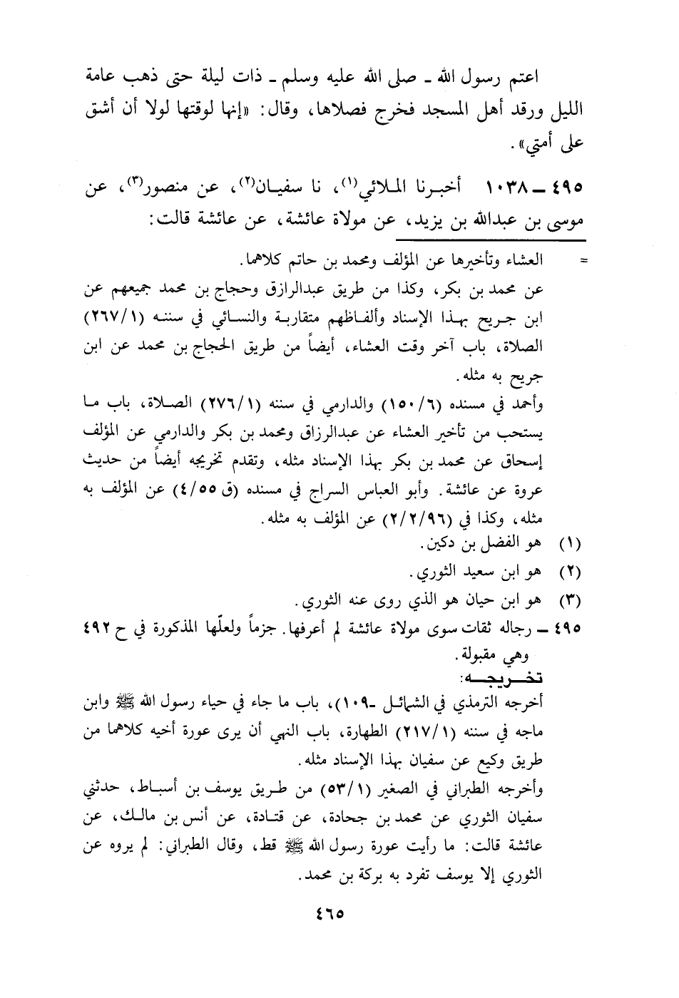 1038 - أَخْبَرَنَا الْمُلَائِيُّ، نا سُفْيَانُ، عَنْ مَنْصُورٍ، عَنْ مُوسَى بْنِ عَبْدِ اللَّهِ بْنِ يَزِيدَ، عَنْ مَوْلَاةِ عَائِشَةَ عَنْ عَائِشَةَ، قَالَتْ: " §مَا نَظَرْتُ إِلَى فَرْجِ رَسُولِ اللَّهِ صَلَّى اللهُ عَلَيْهِ وَسَلَّمَ أَوْ قَالَتْ: مَا رَأَيْتُ فَرْجَ رَسُولِ اللَّهِ صَلَّى اللهُ عَلَيْهِ وَسَلَّمَ "