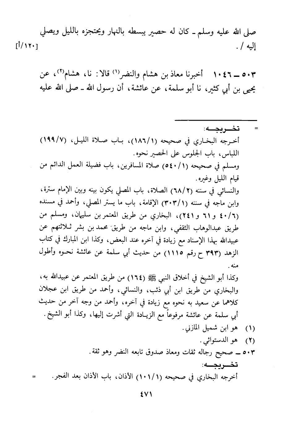 1046 - أَخْبَرَنَا مُعَاذُ بْنُ هِشَامٍ، وَالنَّضْرُ، قَالَا: نا هِشَامٌ، عَنْ يَحْيَى بْنِ أَبِي كَثِيرٍ، نا أَبُو سَلَمَةَ، عَنْ عَائِشَةَ، أَنَّ رَسُولَ اللَّهِ صَلَّى اللهُ عَلَيْهِ وَسَلَّمَ «كَانَ §يُصَلِّي الرَّكْعَتَيْنِ مِنَ التَّدْلِيسِ مِنْ صَلَاةِ الصُّبْحِ» قَالَ: النَّضْرُ عَنْ أَبِي سَلَمَةَ