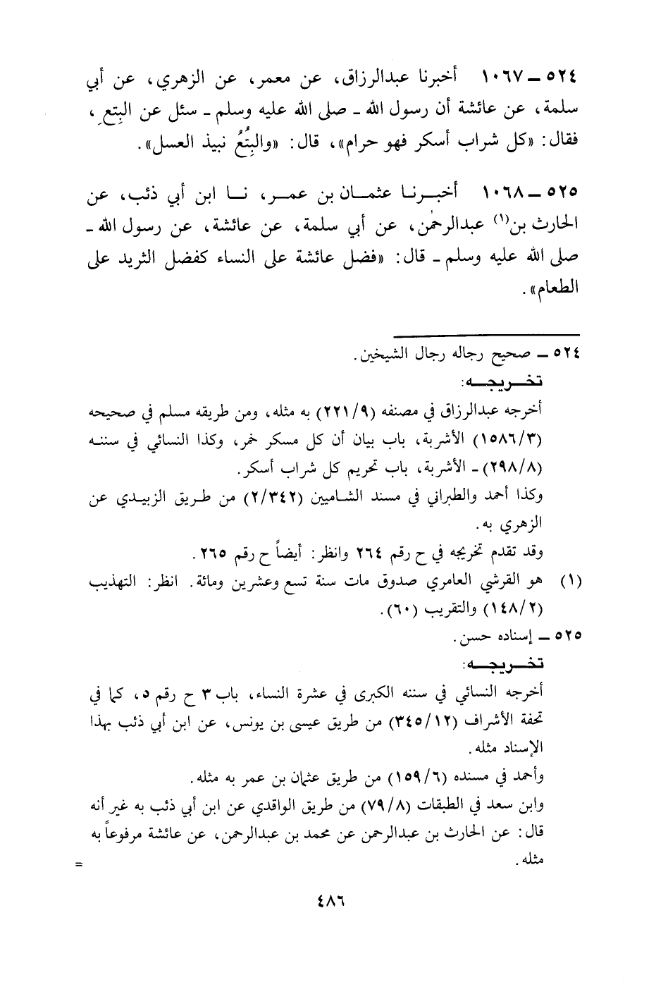 1067 - أَخْبَرَنَا عَبْدُ الرَّزَّاقِ، عَنْ مَعْمَرٍ، عَنِ الزُّهْرِيِّ، عَنْ أَبِي سَلَمَةَ، عَنْ عَائِشَةَ، أَنَّ رَسُولَ اللَّهِ صَلَّى اللهُ عَلَيْهِ وَسَلَّمَ سُئِلَ عَنِ الْبِتْعِ فَقَالَ: «§كُلُّ شَرَابٍ أَسْكَرَ فَهُوَ حَرَامٌ» قَالَ: وَالْبِتْعُ نَبِيذُ الْعَسَلِ