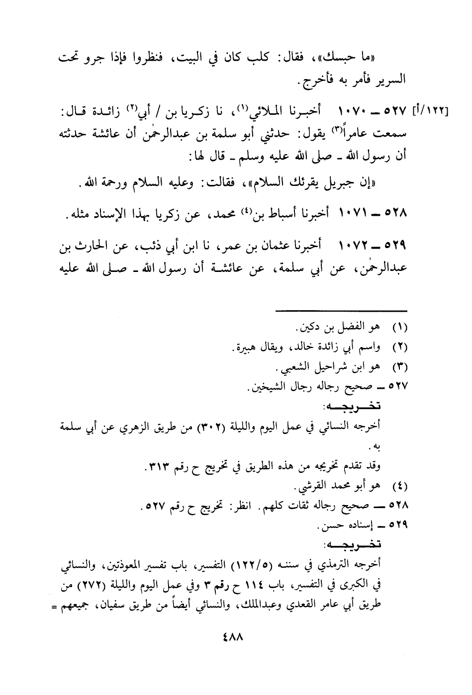 1070 - أَخْبَرَنَا الْمُلَائِيُّ، نا زَكَرِيَّا بْنُ أَبِي زَائِدَةَ، قَالَ: سَمِعْتُ عَامِرًا، يَقُولُ: حَدَّثَنِي أَبُو سَلَمَةَ بْنُ عَبْدِ الرَّحْمَنِ، أَنَّ عَائِشَةَ، حَدَّثَتْهُ أَنَّ رَسُولَ اللَّهِ صَلَّى اللهُ عَلَيْهِ وَسَلَّمَ قَالَ لَهَا: «إِنَّ §جِبْرِيلَ يُقْرِئُكِ السَّلَامَ» فَقَالَتْ: وَعَلَيْهِ السَّلَامُ وَرَحْمَةُ اللَّهِ