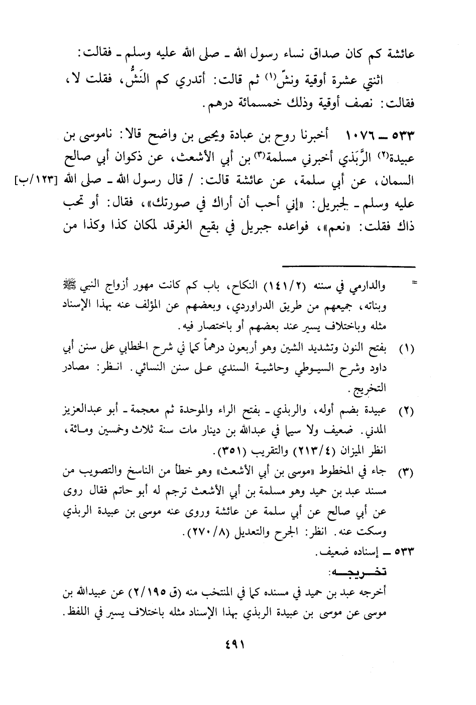 1076 - أَخْبَرَنَا رَوْحُ بْنُ عُبَادَةَ، وَيَحْيَى بْنُ وَاضِحٍ، قَالَا: نا مُوسَى بْنُ عُبَيْدَةَ الرَّبَذِيُّ، أَخْبَرَنِي مَسْلَمَةُ بْنُ أَبِي الْأَشْعَثِ، عَنْ ذَكْوَانَ أَبِي صَالِحٍ السَّمَّانِ، عَنْ أَبِي سَلَمَةَ، عَنْ عَائِشَةَ، قَالَتْ: قَالَ رَسُولُ اللَّهِ صَلَّى اللهُ عَلَيْهِ وَسَلَّمَ لِجِبْرِيلَ: «إِنِّي §أُحِبُّ أَنْ أَرَاكَ فِي صُورَتِكَ» فَقَالَ: أَوَتُحِبُّ ذَاكَ؟ فَقُلْتُ: «نَعَمْ» فَوَاعَدَهُ جِبْرِيلُ فِي بَقِيعِ الْغَرْقَدِ لِمَكَانِ كَذَا وَكَذَا مِنَ اللَّيْلِ فَلَقِيَهُ رَسُولُ اللَّهِ صَلَّى اللهُ عَلَيْهِ وَسَلَّمَ فِي مَوْعِدِهِ فَنَشَرَ جَنَاحًا مِنْ أَجْنِحَتِهِ، وَقَالَ: رَوْحٌ: جَنَاحَيْنِ مِنْ أَجْنِحَتِهِ فَسَدَّ أُفُقَ السَّمَاءِ حَتَّى مَا يَرَى رَسُولُ اللَّهِ صَلَّى اللهُ عَلَيْهِ وَسَلَّمَ مِنَ السَّمَاءِ شَيْئًا وَأُجِيبَ رَسُولُ اللَّهِ صَلَّى اللهُ عَلَيْهِ وَسَلَّمَ عِنْدَ ذَلِكَ