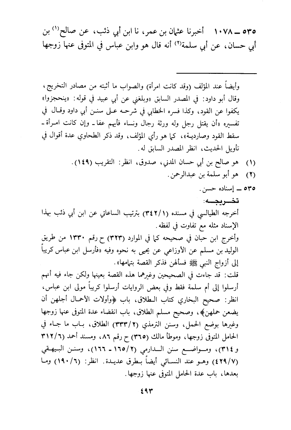 1078 - أَخْبَرَنَا عُثْمَانُ بْنُ عُمَرَ، نا ابْنُ أَبِي ذِئْبٍ، عَنْ صَالِحِ بْنِ أَبِي حَسَّانَ، عَنْ أَبِي سَلَمَةَ أَنَّهُ قَالَ هُوَ وَابْنُ عَبَّاسٍ فِي الْمُتَوَفَّى عَنْهَا زَوْجُهَا وَهِيَ حَامِلٌ فَقَالَ أَبُو سَلَمَةَ: إِذَا وَضَعَتْ مَا فِي بَطْنِهَا فَقَدْ حَلَّتْ وَقَالَ ابْنُ عَبَّاسٍ: آخِرُ الْأَجَلَيْنِ، فَجَاءَ أَبُو هُرَيْرَةَ فَقَالَ: أَنَا مَعَ ابْنِ أَخِي يَعْنِي أَبَا سَلَمَةَ فَأَرْسَلُوا إِلَى عَائِشَةَ فَذَكَرُوا ذَلِكَ لَهَا فَقَالَتْ: «§وَضَعَتْ سُبَيْعَةُ بَعْدَ وَفَاةِ زَوْجِهَا بِلَيَالٍ فَذُكِرَ أَمْرُهَا لِرَسُولِ اللَّهِ صَلَّى اللهُ عَلَيْهِ وَسَلَّمَ فَأَمَرَهَا فَنُكِحَتْ»