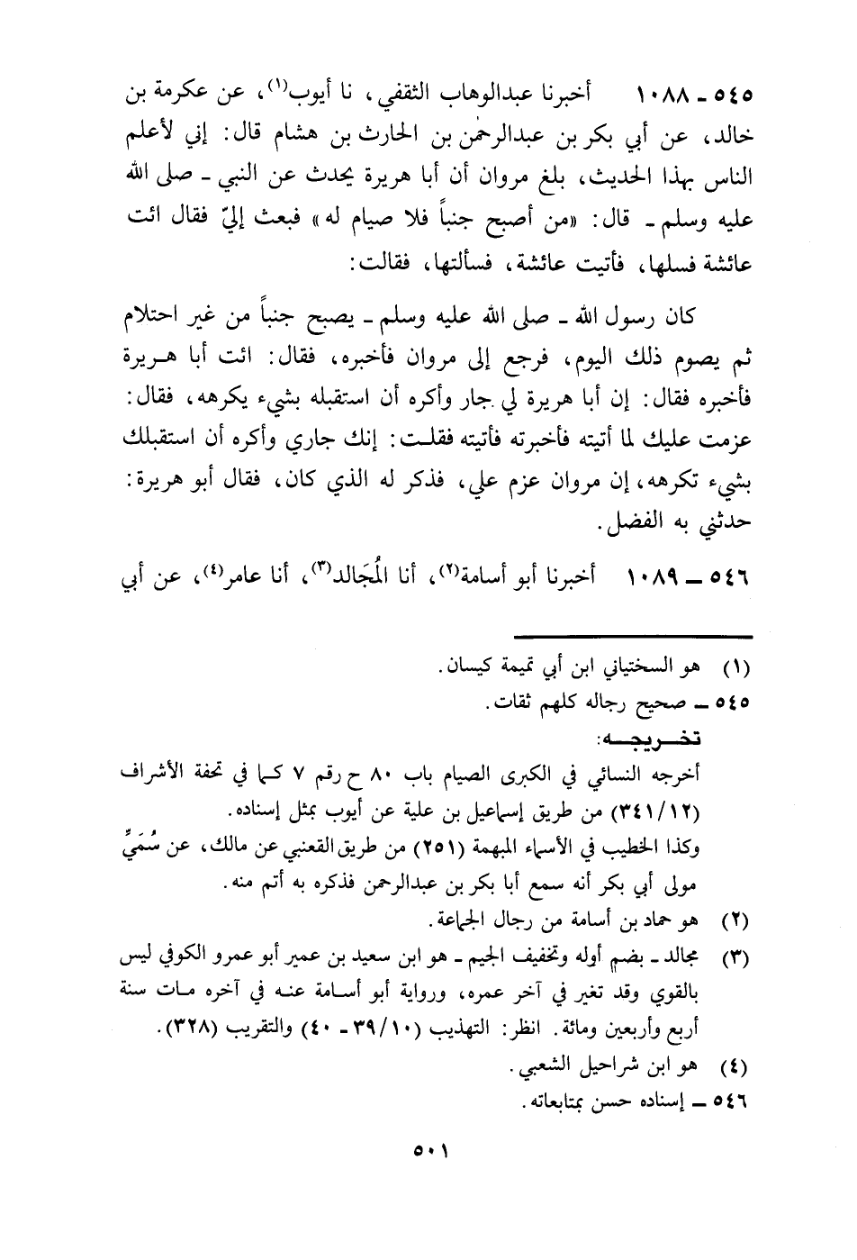 1088 - أَخْبَرَنَا عَبْدُ الْوَهَّابِ الثَّقَفِيُّ، نا أَيُّوبُ، عَنْ عِكْرِمَةَ بْنِ خَالِدٍ، عَنْ أَبِي بَكْرِ بْنِ عَبْدِ الرَّحْمَنِ بْنِ الْحَارِثِ بْنِ هِشِامٍ، قَالَ: إِنِّي لَأَعْلَمُ النَّاسِ بِهَذَا الْحَدِيثِ بَلَغَ مَرْوَانَ أَنَّ أَبَا هُرَيْرَةَ يُحَدِّثُ عَنِ النَّبِيِّ صَلَّى اللهُ عَلَيْهِ وَسَلَّمَ قَالَ: «مَنْ أَصْبَحَ جُنُبًا فَلَا صِيَامَ لَهُ» فَبَعَثَ إِلَيَّ فَقَالَ: ائْتِ عَائِشَةَ فَسَلْهَا فَأَتَيْتُ عَائِشَةَ فَسَأَلْتُهَا فَقَالَتْ: كَانَ رَسُولُ اللَّهِ صَلَّى اللهُ عَلَيْهِ وَسَلَّمَ §يُصْبِحُ جُنُبًا مِنْ غَيْرِ احْتِلَامٍ ثُمُّ يَصُومُ ذَلِكَ " الْيَوْمَ فَرَجَعَ إِلَى مَرْوَانَ فَأَخْبَرَهُ فَقَالَ: ائْتِ أَبَا هُرَيْرَةَ فَأَخْبِرْهُ فَقَالَ: إِنَّ أَبَا هُرَيْرَةَ لِي جَارٌ وَأَكْرَهُ أَنْ أَسْتَقْبِلَهُ بِشَيْءٍ يَكْرَهُهُ فَقَالَ: عَزَمْتُ عَلَيْكَ لَمَا أَتَيْتَهُ فَأَخْبَرْتَهُ فَأَتَيْتُهُ فَقُلْتُ إِنَّكَ جَارِي وَأَكْرَهُ أَنْ أَسْتَقْبِلُكَ بِشَيْءٍ تَكْرَهَهُ، إِنَّ مَرْوَانَ عَزَمَ عَلَيَّ فَذَكَرَ لَهُ الَّذِي كَانَ فَقَالَ: أَبُو هُرَيْرَةَ حَدَّثَنِي بِهِ الْفَضْلُ