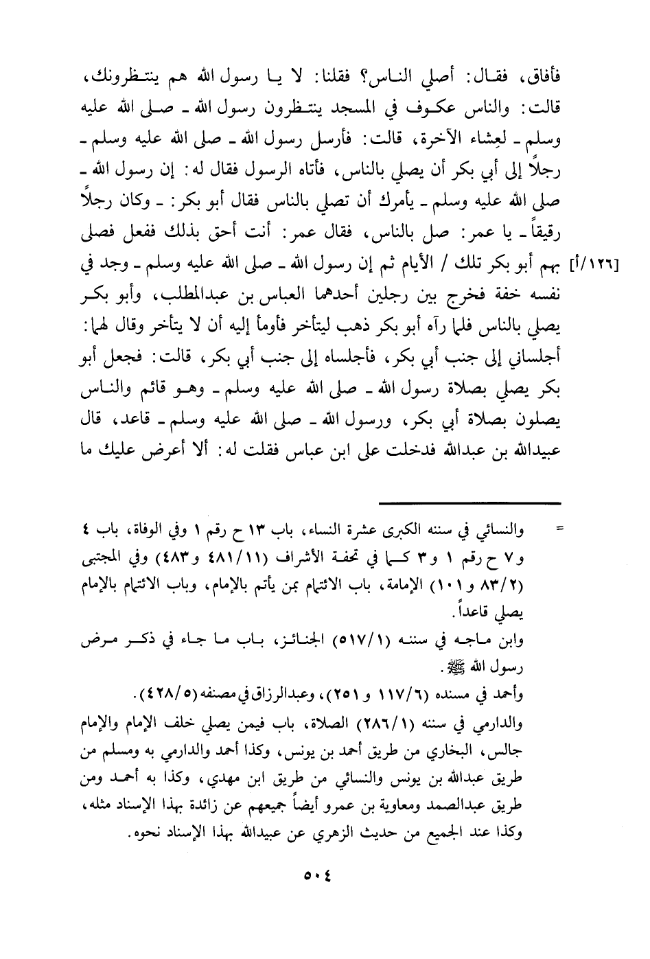 فَقَالَ عُمَرُ : أَنْتَ أَحَقُّ بِذَلِكَ ، فَفَعَلَ فَصَلَّى بِهِمْ أَبُو بَكْرٍ تِلْكَ الأَيَّامَ ، ثُمَّ إِنَّ رَسُولَ اللَّهِ صَلَّى اللَّهُ عَلَيْهِ وَسَلَّمَ وَجَدَ فِي نَفْسِهِ خِفَّةً ، فَخَرَجَ بَيْنَ رَجُلَيْنِ أَحَدُهُمَا الْعَبَّاسُ بْنُ عَبْدِ الْمُطَّلِبِ ، وَأَبُو بَكْرٍ يُصَلِّي بِالنَّاسِ ، فَلَمَّا رَآهُ أَبُو بَكْرٍ ذَهَبَ لِيَتَأَخَّرَ فَأَوْمَأَ إِلَيْهِ أَنْ لاَ يَتَأَخَّرَ ، وَقَالَ لَهُمَا : أَجْلِسَانِي إِلَى جَنْبِ أَبِي بَكْرٍ ، فَأَجْلَسَاهُ إِلَى جَنْبِ أَبِي بَكْرٍ قَالَتْ : فَجَعَلَ أَبُو بَكْرٍ يُصَلِّي بِصَلاَةِ رَسُولِ اللَّهِ صَلَّى اللَّهُ عَلَيْهِ وَسَلَّمَ وَهُوَ قَائِمٌ وَالنَّاسُ يُصَلُّونَ بِصَلاَةِ أَبِي بَكْرٍ وَرَسُولُ اللَّهِ صَلَّى اللَّهُ عَلَيْهِ وَسَلَّمَ قَاعِدٌ.