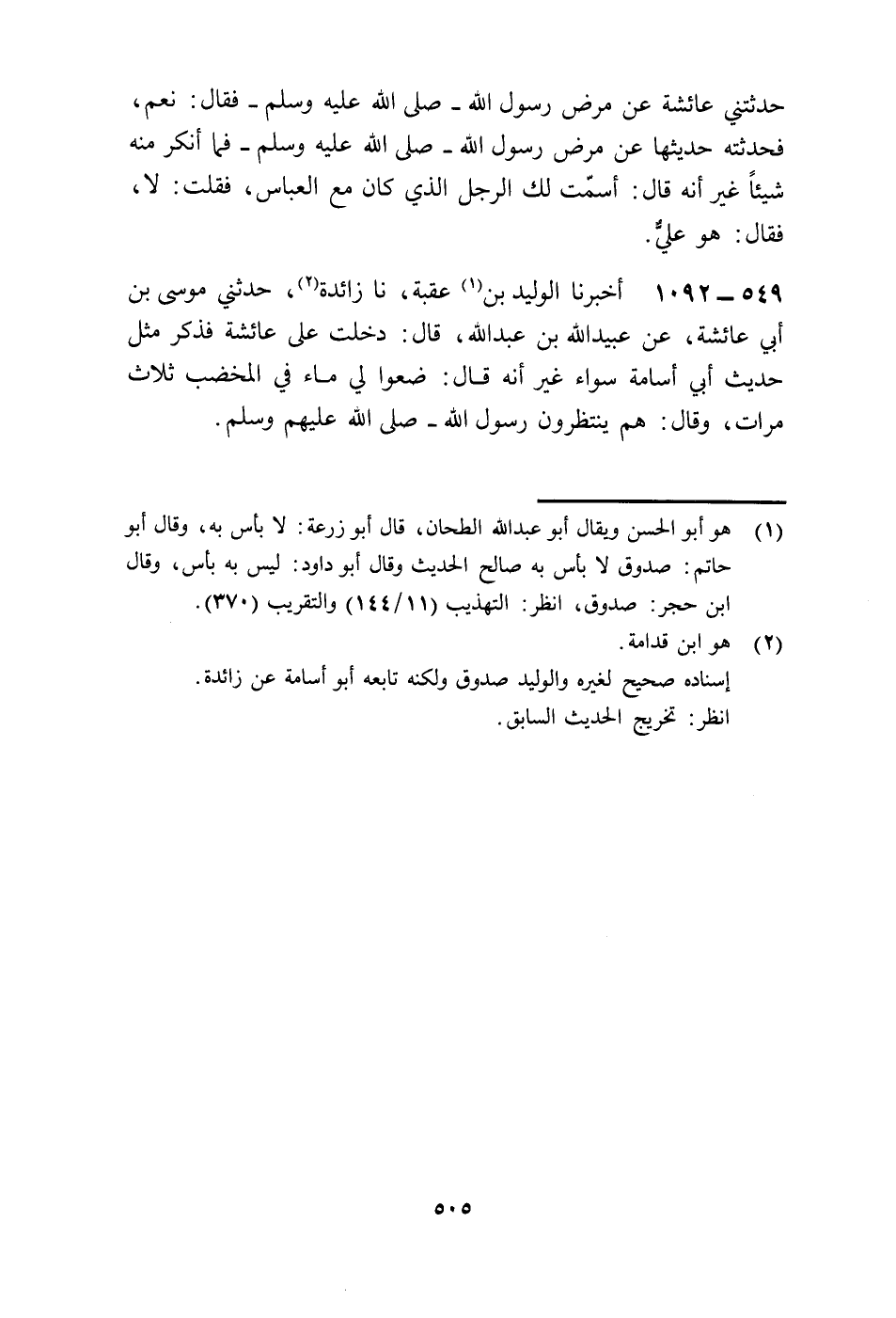 1092- أَخْبَرَنَا الْوَلِيدُ بْنُ عُقْبَةَ ، حَدَّثَنَا زَائِدَةُ ، حَدَّثَنِي مُوسَى بْنُ أَبِي عَائِشَةَ ، عَنْ عُبَيْدِ اللَّهِ بْنِ عَبْدِ اللَّهِ ، قَالَ : دَخَلْتُ عَلَى عَائِشَةَ ، فَذَكَرَ مِثْلَ حَدِيثِ أَبِي أُسَامَةَ سَوَاءً ، غَيْرَ أَنَّهُ قَالَ : ضَعُوا لِي مَاءً فِي الْمِخْضَبِ ثَلاَثَ مَرَّاتٍ ، وَقَالَ : هُمْ يَنْتَظِرُونَ رَسُولَ اللَّهِ صَلَّى اللَّهُ عَلَيْهِ وَسَلَّمَ.