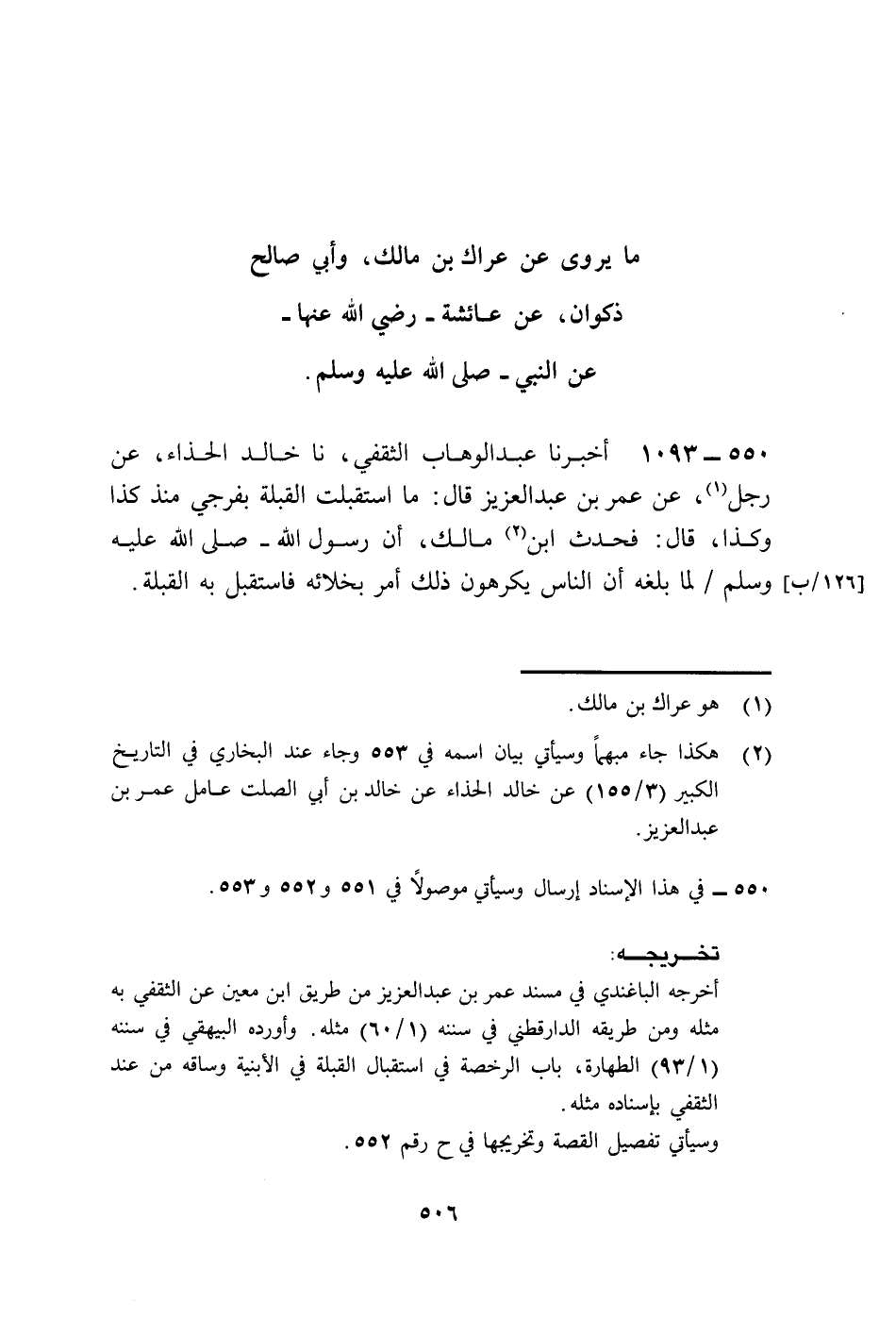 1093 - أَخْبَرَنَا عَبْدُ الْوَهَّابِ الثَّقَفَيُّ، نا خَالِدٌ الْحَذَّاءُ، عَنْ رَجُلٍ، عَنْ عُمَرَ بْنِ عَبْدِ الْعَزِيزِ، قَالَ: §مَا اسْتَقْبَلْتُ الْقِبْلَةَ بِفَرْجِي مُنْذُ كَذَا وَكَذَا قَالَ: فَحَدَّثَ ابْنُ مَالِكٍ أَنَّ رَسُولَ اللَّهِ صَلَّى اللهُ عَلَيْهِ وَسَلَّمَ لَمَّا بَلَغَهُ أَنَّ النَّاسَ يَكْرَهُونَ ذَلِكَ أَمَرَ بِخَلَائِهِ فَاسْتَقْبَلَ بِهِ الْقِبْلَةَ