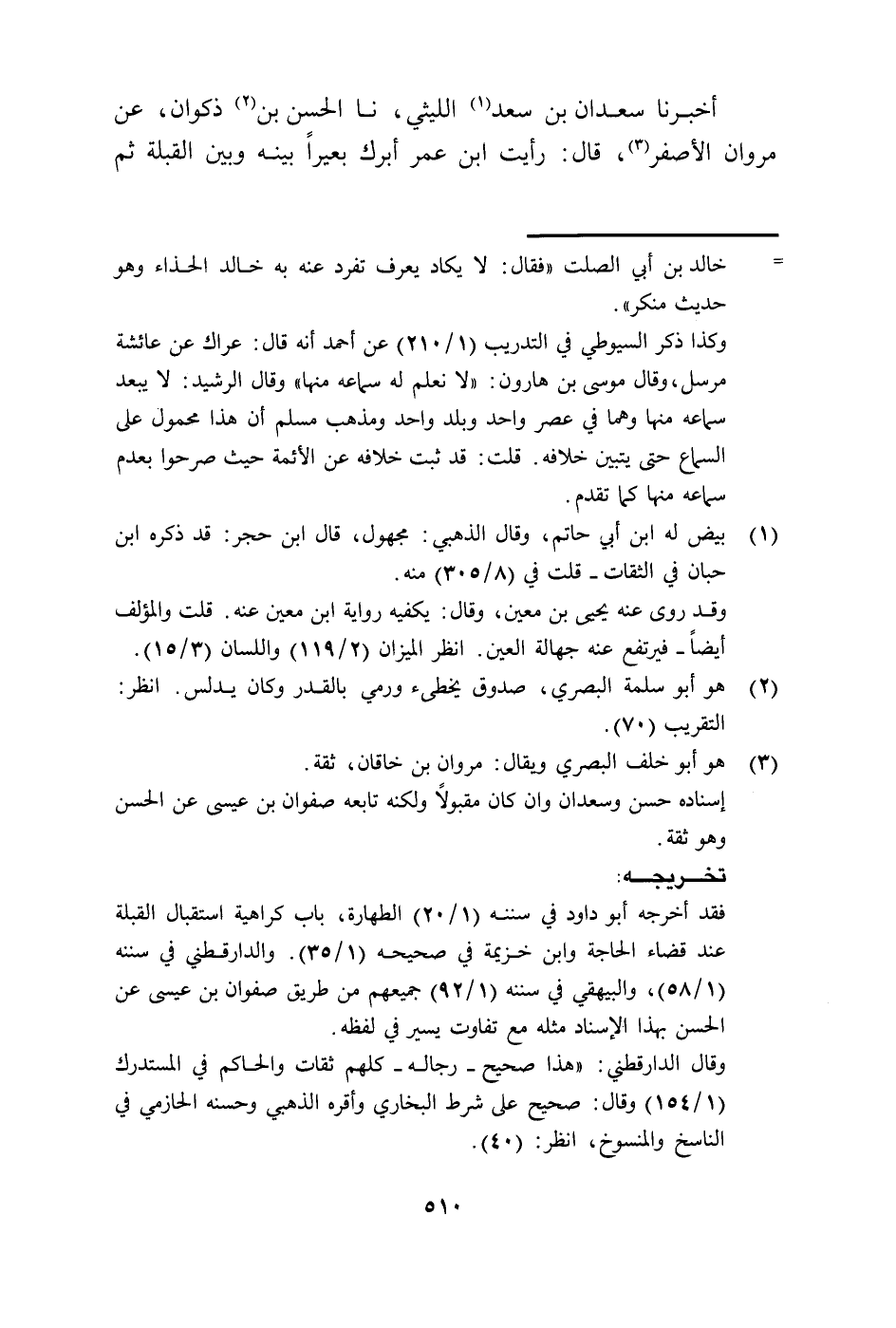 1096م- (1)أَخْبَرَنَا سَعْدَانُ بْنُ سَعْدٍ اللَّيْثِيُّ ، نَا الْحَسَنُ بْنُ ذَكْوَانَ ، عَنْ مَرْوَانَ الأَصْفَرِ ، قَالَ : رَأَيْتُ ابْنَ عُمَرَ أَبْرَكَ بَعِيرًا بَيْنَهُ وَبَيْنَ الْقِبْلَةِ ، ثُمَّ بَالَ ، فَقُلْتُ : يَا أَبَا عَبْدِ الرَّحْمَنِ ، أَلَسْتُمْ تَكْرَهُونَ هَذَا ؟ قَالَ : إِذَا كَانَ بَيْنَكَ وَبَيْنَ الْقِبْلَةِ مَا يَسْتُرُهَا فَلاَ بَأْسَ.
