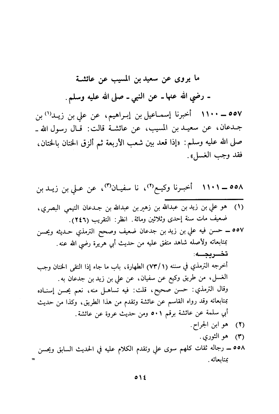 1101 - أَخْبَرَنَا وَكِيعٌ، نا سُفْيَانُ، عَنْ عَلِيِّ بْنِ زَيْدِ بْنِ جُدْعَانَ، عَنْ سَعِيدِ بْنِ الْمُسَيِّبِ، عَنْ عَائِشَةَ، عَنْ رَسُولِ اللَّهِ صَلَّى اللهُ عَلَيْهِ وَسَلَّمَ قَالَ: «§إِذَا جَاوَزَ الْخِتَانُ الْخِتَانَ فَقَدْ وَجَبَ الْغُسْلَ»