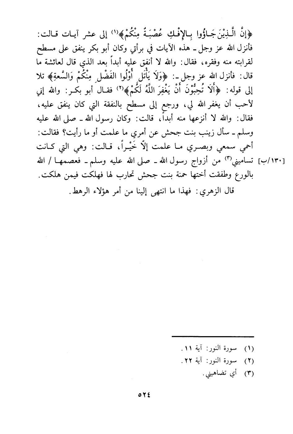 فَأَنْزَلَ اللَّهُ : {إِنَّ الَّذِينَ جَاؤُوا بِالإِفْكِ عُصْبَةٌ مِنْكُمْ} إِلَى عَشْرِ آيَاتٍ ، قَالَتْ : فَأَنْزَلَ اللَّهُ عَزَّ وَجَلَّ هَذِهِ الْآيَاتِ فِي بَرَاءَتِي ، وَكَانَ أَبُو بَكْرٍ يُنْفِقُ عَلَى مِسْطَحٍ لِقَرَابَتِهِ مِنْهُ وَفَقْرِهِ فَقَالَ : وَاللَّهِ لاَ أُنْفِقُ عَلَيْهِ أَبَدًا بَعْدَ الَّذِي قَالَ لِعَائِشَةَ مَا قَالَ ، فَأَنْزَلَ اللَّهُ عَزَّ وَجَلَّ : {وَلاَ يَأْتَلِ أُولُو الْفَضْلِ مِنْكُمْ وَالسَّعَةِ} تَلاَ إِلَى قَوْلِهِ : {أَلاَ تُحِبُّونَ أَنْ يَغْفِرَ اللَّهُ لَكُمْ} فَقَالَ أَبُو بَكْرٍ : وَاللَّهِ إِنِّي لأُحِبُّ أَنْ يَغْفِرَ اللَّهُ لِي ، وَرَجَعَ إِلَى مِسْطَحٍ بِالنَّفَقَةِ الَّتِي كَانَ يُنْفِقُ عَلَيْهِ ، فَقَالَ : وَاللَّهِ لاَ أَنْزَعُهَا مِنْهُ أَبَدًا ، قَالَتْ : وَكَانَ رَسُولُ اللَّهِ صَلَّى اللَّهُ عَلَيْهِ وَسَلَّمَ سَأَلَ زَيْنَبَ بِنْتَ جَحْشٍ عَنْ أَمْرِي : مَا عَلِمَتِ ، أَوَ مَا رَأَيْتِ ؟ فَقَالَتْ : أَحْمِي سَمْعِي وَبَصَرِي ، مَا عَلِمْتُ إِلاَّ خَيْرًا ، قَالَتْ : وَهِيَ الَّتِي كَانَتْ تُسَامِينِي مِنْ أَزْوَاجِ رَسُولِ اللَّهِ صَلَّى اللَّهُ عَلَيْهِ وَسَلَّمَ ، فَعَصَمَهَا اللَّهُ بِالْوَرَعِ ، وَطَفِقَتْ أُخْتُهَا حَمْنَةُ بِنْتُ جَحْشٍ تُحَارِبُ لَهَا ، فَهَلَكَتْ فِيمَنْ هَلَكَ.