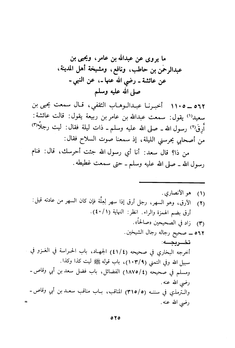 1105 - أَخْبَرَنَا عَبْدُ الْوَهَّابِ الثَّقَفِيُّ قَالَ: سَمِعْتُ يَحْيَى بْنَ سَعِيدٍ، يَقُولُ: سَمِعْتُ عَبْدَ اللَّهِ بْنَ عَامِرِ بْنِ رَبِيعَةَ يَقُولُ: قَالَتْ عَائِشَةُ: أَرِقَ رَسُولُ اللَّهِ صَلَّى اللهُ عَلَيْهِ وَسَلَّمَ ذَاتَ لَيْلَةٍ فَقَالَ: «لَيْتَ رَجُلًا §مِنْ أَصْحَابِي يَحْرُسُنِي اللَّيْلَةَ» إِذْ سَمِعْنَا صَوْتَ السِّلَاحِ فَقَالَ: «مَنْ ذَا؟» قَالَ سَعْدٌ: أَنَا أَيْ رَسُولَ اللَّهِ جِئْتُ أَحْرُسُكَ، قَالَ: فَنَامَ رَسُولُ اللَّهِ صَلَّى اللهُ عَلَيْهِ وَسَلَّمَ حَتَّى سَمِعْتُ غَطِيطَهُ