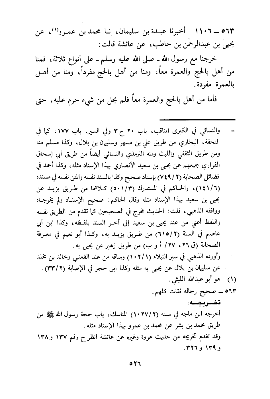 1106 - أَخْبَرَنَا عَبْدَةُ بْنُ سُلَيْمَانَ، نا مُحَمَّدُ بْنُ عَمْرٍو، عَنْ يَحْيَى بْنِ عَبْدِ الرَّحْمَنِ بْنِ حَاطِبٍ، عَنْ عَائِشَةَ، قَالَتْ: خَرَجْنَا مَعَ رَسُولِ اللَّهِ صَلَّى اللهُ عَلَيْهِ وَسَلَّمَ عَلَى أَنوَاعٍ ثَلَاثَةٍ §فَمِنَّا مَنْ أَهَلَّ بِالْحَجِّ وَالْعُمْرَةِ مَعًا وَمِنَّا مَنْ أَهَلَّ بِالْحَجِّ مُفْرَدًا وَمِنَّا مَنْ أَهَلَّ بِالْعُمْرَةِ مُفْرَدَةً فَأَمَّا مَنْ أَهَلَّ بِالْحَجِّ وَالْعُمْرَةِ مَعًا فَلَمْ يَحِلَّ مِنْ شَيْءٍ حَرُمَ عَلَيْهِ حَتَّى يَقْضِيَ مَنَاسِكَ الْحَجِّ وَمَنْ أَهَلَّ بِالْعُمْرَةِ فَطَافَ بِالْبَيْتِ وَبَيَنَ الصَّفَا وَالْمَرْوَةِ حَلَّ مِمَّا كَانَ حَرُمَ عَلَيْهِ حَتَّى يَسْتَقْبِلَ