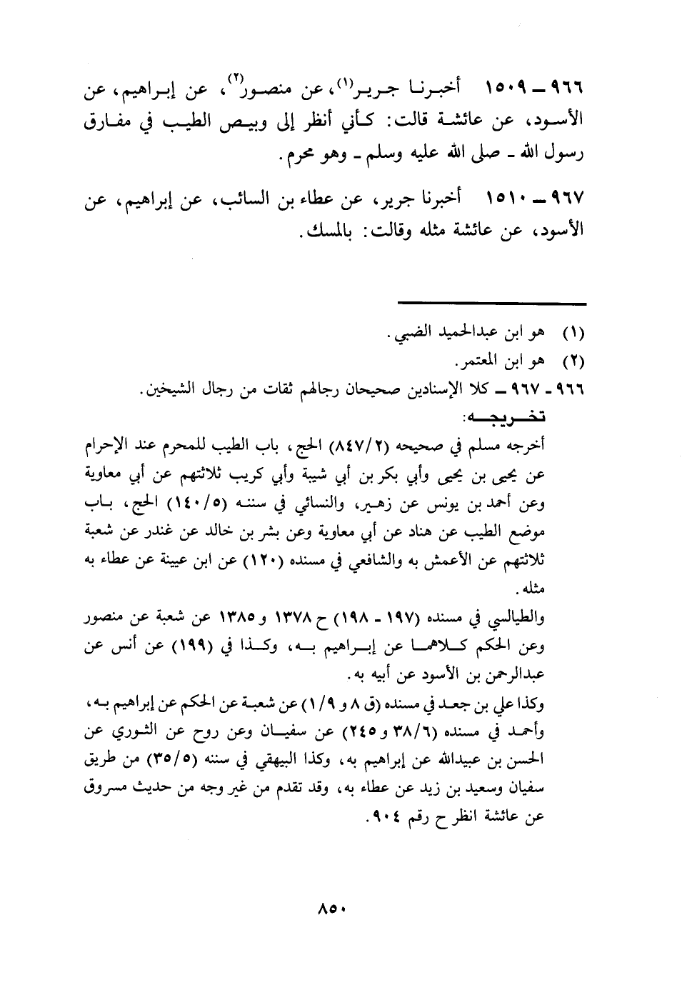 1509 - أَخْبَرَنَا جَرِيرٌ، عَنْ مَنْصُورٍ، عَنْ إِبْرَاهِيمَ، عَنِ الْأَسْوَدِ، عَنْ عَائِشَةَ، قَالَتْ: «§كَأَنِّي أَنْظُرُ إِلَى وَبِيصِ الطِّيبِ فِي مَفَارِقِ رَسُولِ اللَّهِ صَلَّى اللهُ عَلَيْهِ وَسَلَّمَ وَهُوَ مُحْرِمٌ»