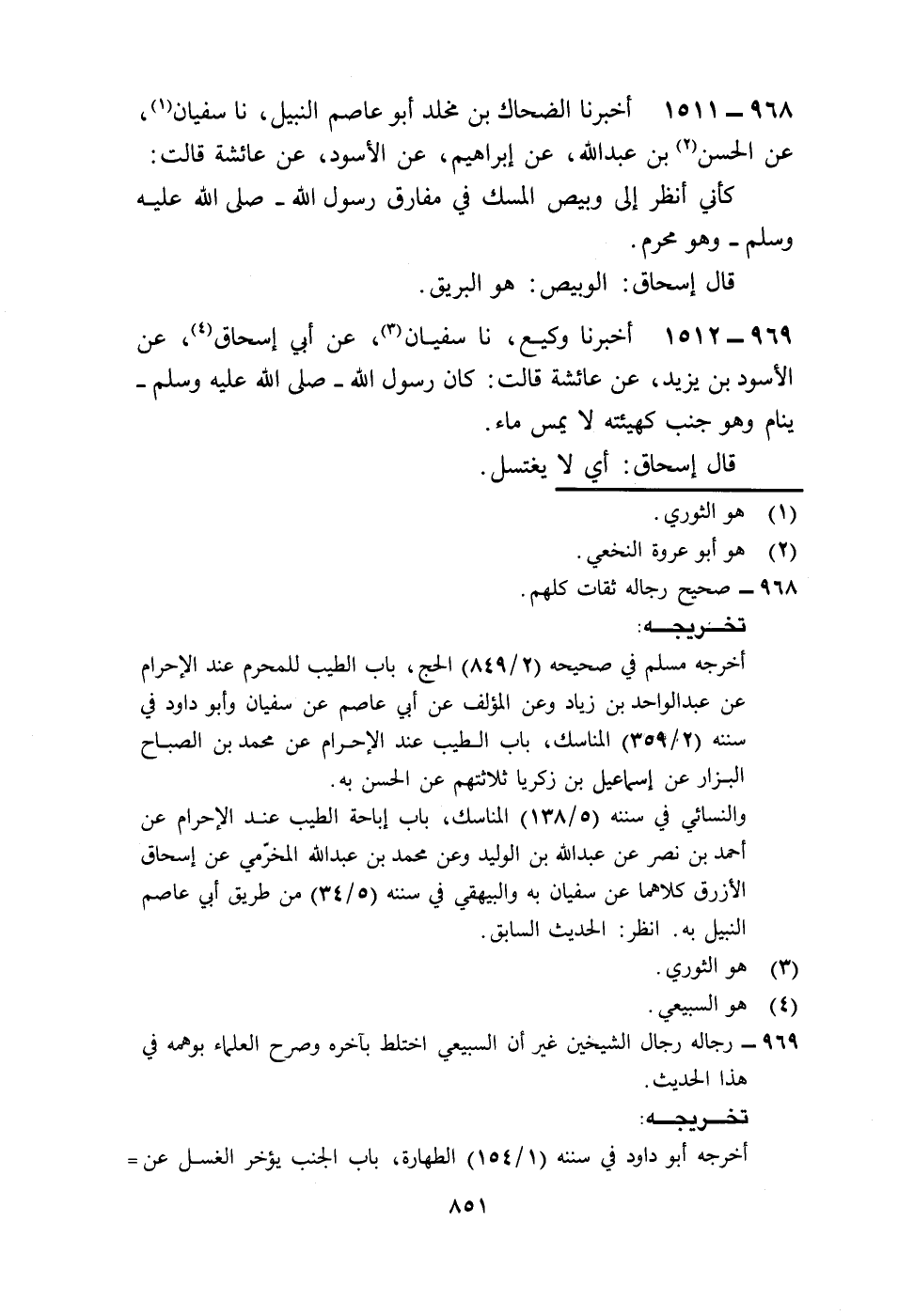 1511 - أَخْبَرَنَا الضَّحَّاكُ بْنُ مَخْلَدٍ أَبُو عَاصِمٍ النَّبِيلُ، نا سُفْيَانُ، عَنِ الْحَسَنِ بْنِ عَبْدِ اللَّهِ، عَنْ إِبْرَاهِيمَ، عَنِ الْأَسْوَدِ، عَنْ عَائِشَةَ، قَالَتْ: «§كَأَنِّي أَنْظُرُ إِلَى وَبِيصِ الْمِسْكِ فِي مَفَارِقِ رَسُولِ اللَّهِ صَلَّى اللهُ عَلَيْهِ وَسَلَّمَ وَهُوَ مُحْرِمٌ» ، قَالَ إِسْحَاقُ: الْوَبِيصُ: هُوَ الْبَرِيقُ