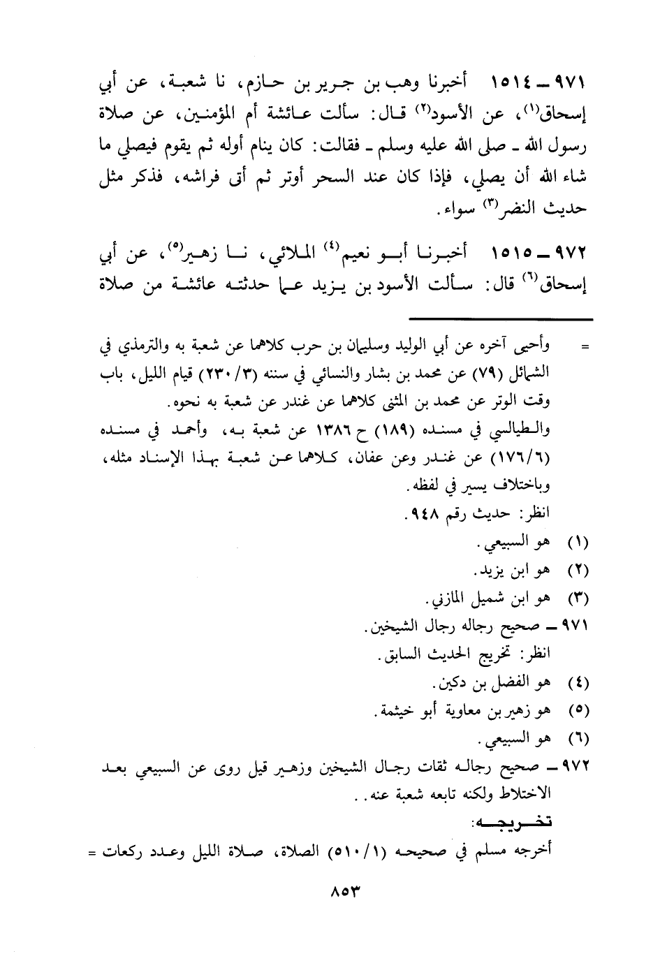1514 - أَخْبَرَنَا وَهْبُ بْنُ جَرِيرِ بْنِ حَازِمٍ، نا شُعْبَةُ، عَنْ أَبِي إِسْحَاقَ، عَنِ الْأَسْوَدِ، قَالَ: سَأَلْتُ عَائِشَةَ أُمَّ الْمُؤْمِنِينَ عَنْ صَلَاةِ رَسُولِ اللَّهِ صَلَّى اللهُ عَلَيْهِ وَسَلَّمَ، فَقَالَتْ: «§كَانَ يَنَامُ أَوَّلَهُ ثُمَّ يَقُومُ فَيُصَلِّي مَا شَاءَ اللَّهُ أَنْ يُصَلِّي فَإِذَا كَانَ عِنْدَ السَّحَرِ أَوْتَرَ ثُمَّ أَتَى فِرَاشَهُ» فَذَكَرَ مِثْلَ حَدِيثِ النَّضْرِ سَوَاءً