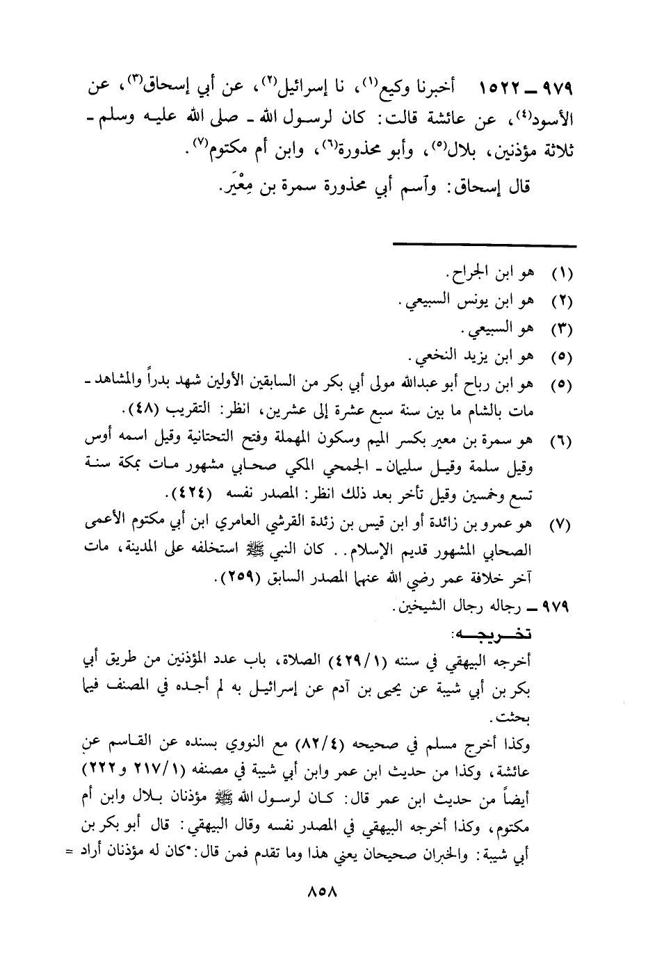 1522 - أَخْبَرَنَا وَكِيعٌ، نا إِسْرَائِيلُ، عَنْ أَبِي إِسْحَاقَ، عَنِ الْأَسْوَدِ، عَنْ عَائِشَةَ، قَالَتْ: " §كَانَ لِرَسُولِ اللَّهِ صَلَّى اللهُ عَلَيْهِ وَسَلَّمَ ثَلَاثَةُ مُؤَذِّنِينَ: بِلَالٌ، وَأَبُو مَحْذُورَةَ، وَابْنُ أُمِّ مَكْتُومٍ قَالَ إِسْحَاقُ: وَاسْمُ أَبِي مَحْذُورَةَ: سَمُرَةُ بْنُ مِعْيَرٍ