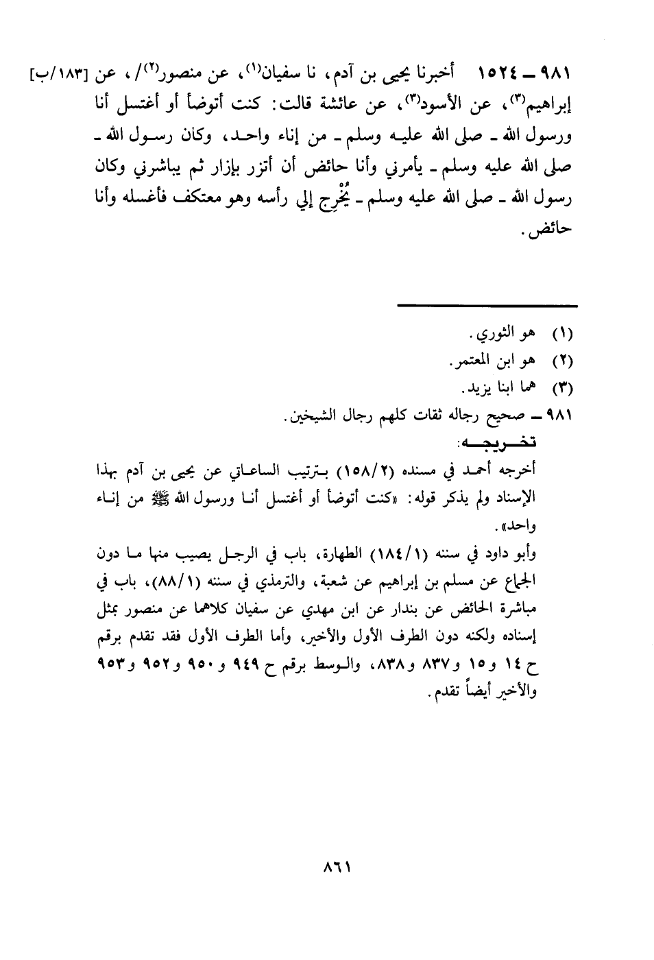 1524 - أَخْبَرَنَا يَحْيَى بْنُ آدَمَ، نا سُفْيَانُ، عَنْ مَنْصُورٍ، عَنْ إِبْرَاهِيمَ، عَنِ الْأَسْوَدِ، عَنْ عَائِشَةَ، قَالَتْ: «§كُنْتُ أَتَوَضَّأُ أَوْ أَغْتَسِلُ أَنَا وَرَسُولُ اللَّهِ صَلَّى اللهُ عَلَيْهِ وَسَلَّمَ مِنْ إِنَاءٍ وَاحِدٍ وَكَانَ رَسُولُ اللَّهِ صَلَّى اللهُ عَلَيْهِ وَسَلَّمَ يَأْمُرُنِي وَأَنَا حَائِضٌ أَنْ أَتَّزِرَ بِإِزَارٍ ثُمَّ يُبَاشِرُنِي وَكَانَ رَسُولُ اللَّهِ صَلَّى اللهُ عَلَيْهِ وَسَلَّمَ يُخْرِجُ إِلَيَّ رَأْسَهُ وَهُوَ مُعْتَكِفٌ فَأَغْسِلُهُ وَأَنَا حَائِضٌ»