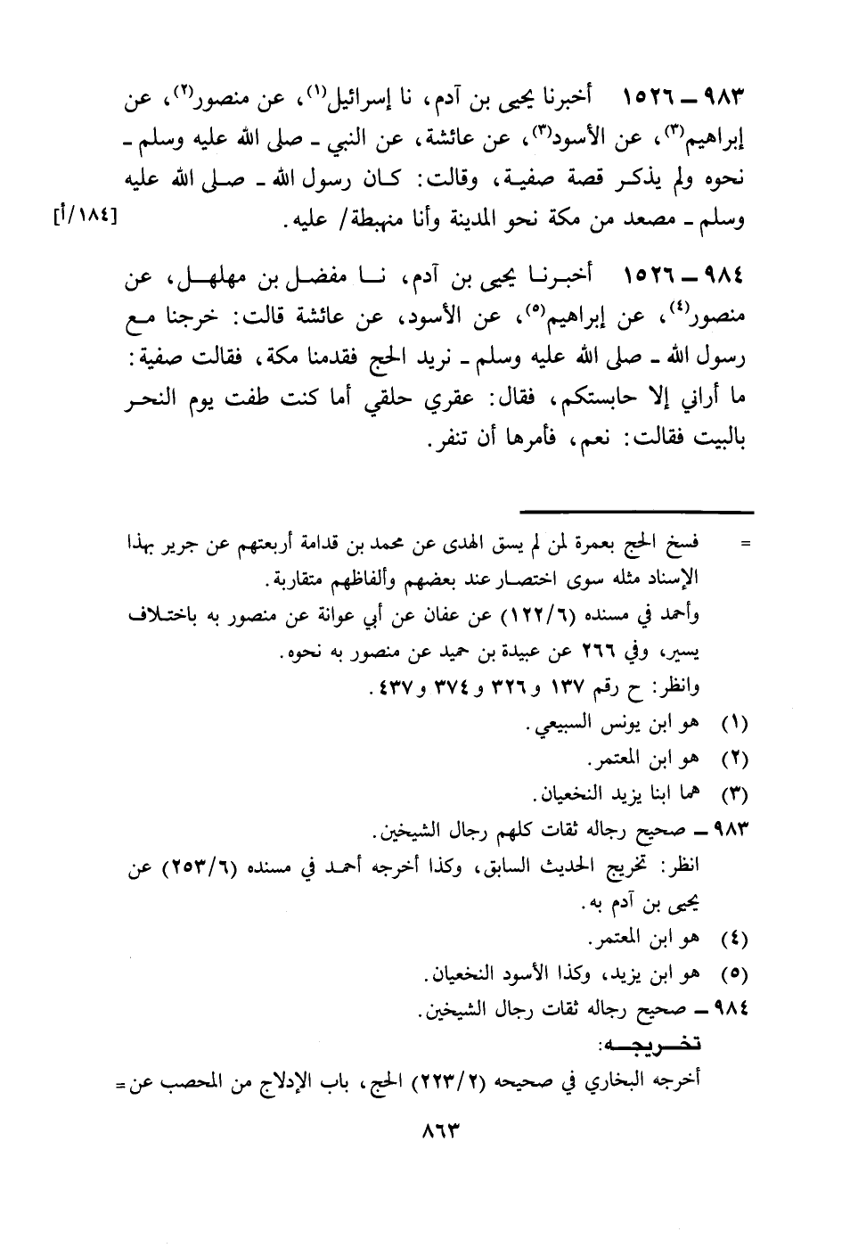 أَخْبَرَنَا يَحْيَى بْنُ آدَمَ، نا مُفَضَّلُ بْنُ مُهَلْهَلٍ، عَنْ مَنْصُورٍ، عَنْ إِبْرَاهِيمَ، عَنِ الْأَسْوَدِ، عَنْ عَائِشَةَ، قَالَتْ: " خَرَجْنَا مَعَ رَسُولِ اللَّهِ صَلَّى اللهُ عَلَيْهِ وَسَلَّمَ نُرِيدُ الْحَجَّ، فَقَدِمْنَا مَكَّةَ، فَقَالَتْ صَفِيَّةُ: مَا أَرَانِي إِلَّا حَابِسَتَكُمْ، فَقَالَ: §عَقْرَى حَلْقَى، أَمَا كُنْتِ طُفْتِ يَوْمَ النَّحْرِ بِالْبَيْتِ؟ فَقَالَتْ: نَعَمْ. فَأَمَرَهَا أَنْ تَنْفِرَ "