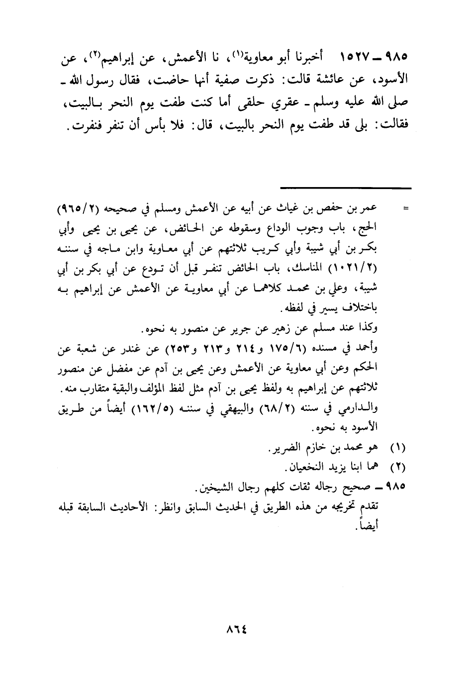 1527 - أَخْبَرَنَا أَبُو مُعَاوِيَةَ، نا الْأَعْمَشُ، عَنْ إِبْرَاهِيمَ، عَنِ الْأَسْوَدِ، عَنْ عَائِشَةَ، قَالَتْ: " ذَكَرَتْ صَفِيَّةُ أَنَّهَا حَاضَتْ، فَقَالَ رَسُولُ اللَّهِ صَلَّى اللهُ عَلَيْهِ وَسَلَّمَ: §عَقْرَى حَلْقَى، أَمَا كُنْتِ طُفْتِ يَوْمَ النَّحْرِ بِالْبَيْتِ؟ فَقَالَتْ: بَلَى قَدْ طُفْتُ يَوْمَ النَّحْرِ بِالْبَيْتِ. قَالَ: فَلَا بَأْسَ أَنْ تَنْفِرِي، فَنَفَرْتُ "