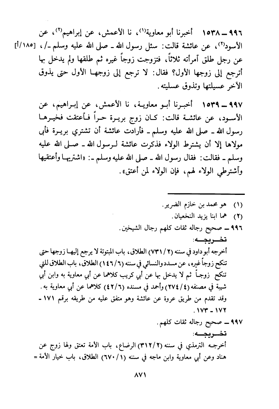 1538 - أَخْبَرَنَا أَبُو مُعَاوِيَةَ، نا الْأَعْمَشُ، عَنْ إِبْرَاهِيمَ، عَنِ الْأَسْوَدِ، عَنْ عَائِشَةَ، قَالَتْ: سُئِلَ رَسُولُ اللَّهِ صَلَّى اللهُ عَلَيْهِ وَسَلَّمَ عَنْ رَجُلٍ طَلَّقَ امْرَأَتَهُ ثَلَاثًا فَتَزَوَّجَتْ زَوْجًا غَيْرَهُ ثُمَّ طَلَّقَهَا وَلَمْ يَدْخُلْ بِهَا، أَتَرْجِعُ إِلَى زَوْجِهَا الْأَوَّلِ؟ فَقَالَ: «§لَا تَرْجِعُ إِلَى زَوْجِهَا الْأَوَّلِ حَتَّى يَذُوقَ الْأَخَرُ عُسَيْلَتَهَا وَتَذُوقَ عُسَلْيَتَهُ»